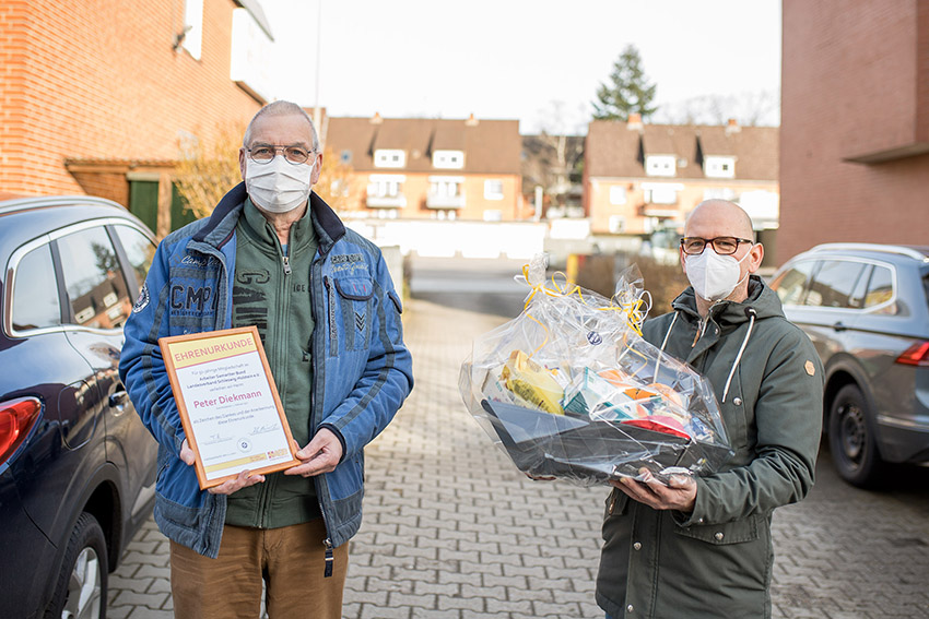 ASB-Geschäftsführer Mario Leuner überreicht einen Präsentkorb an Peter Diekmann (li.). Fotos: ASB/O. Renter