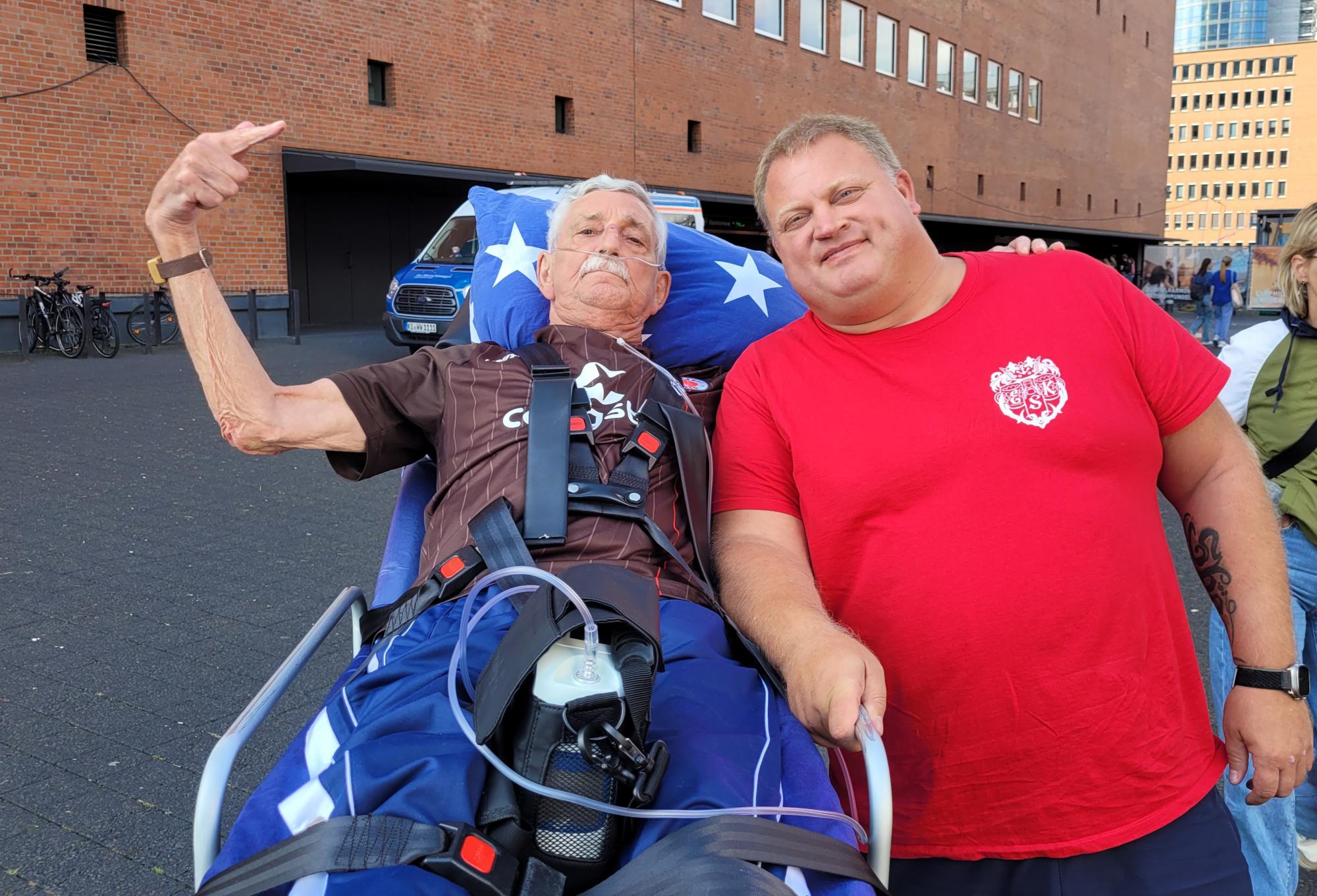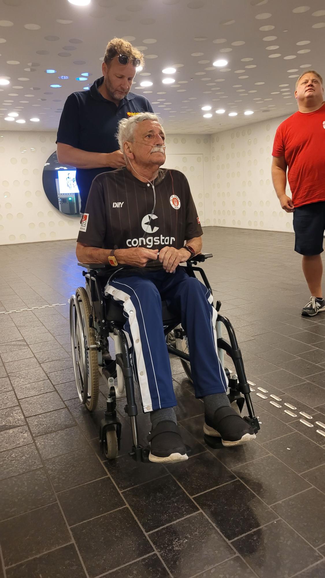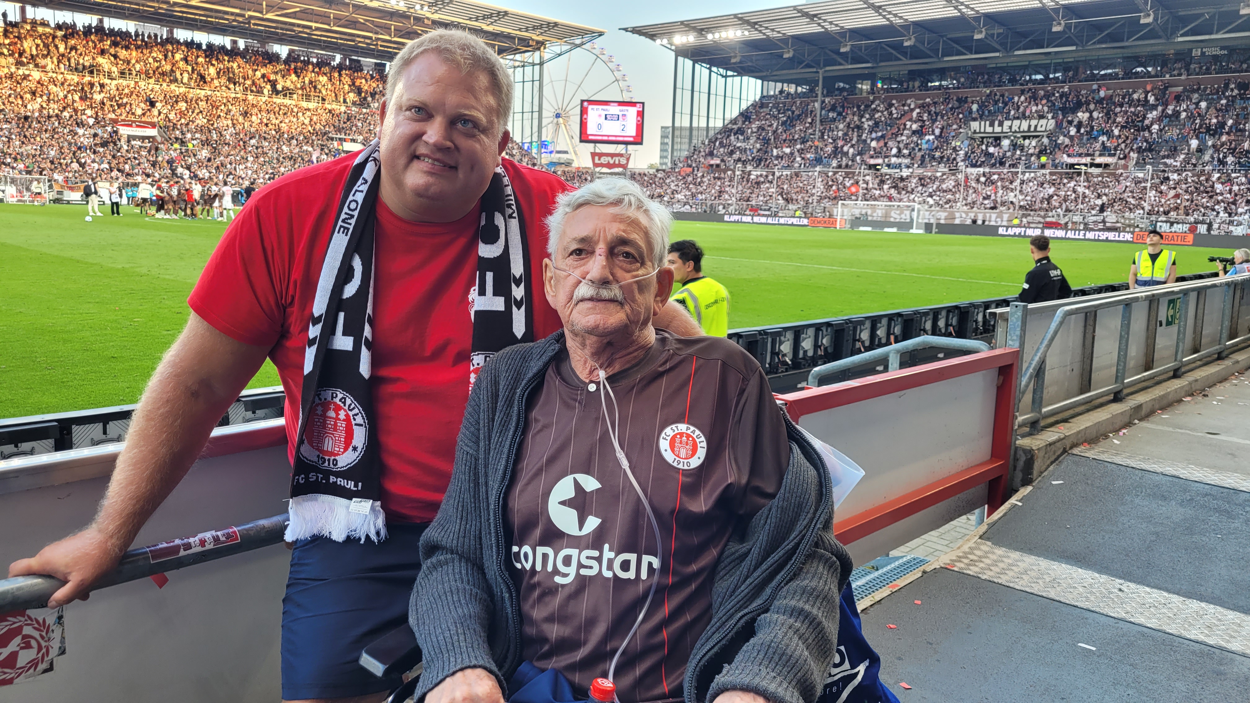 Wie groß seine Liebe zu diesem Verein ist, konnte kaum übersehen werden: Eine große St. Pauli Flagge zierte sein Zimmer, das Fan-Shirt hatte er bereits angezogen und der Fan-Schal lag auch schon bereit. Zusammen mit seinem Sohn Fabian und unseren Wunscherfüllern Lars und Jonas konnte die Fahrt in Richtung Hamburg beginnen. Natürlich gab jeder vor der Abfahrt einen Tipp ab, wie das heutige Spiel gegen den FC Heidenheim wohl ausgehen mochte. Im Nachhinein hatte zwar keiner von uns richtig getippt, doch Rüdiger hatte bereits vor dem Spiel ganz richtig festgestellt: „Eigentlich ist es egal, wie das Spiel ausgeht. Die Hauptsache ist, dass wir heute alle Spaß haben!“ Und das sollte sich bewahrheiten.