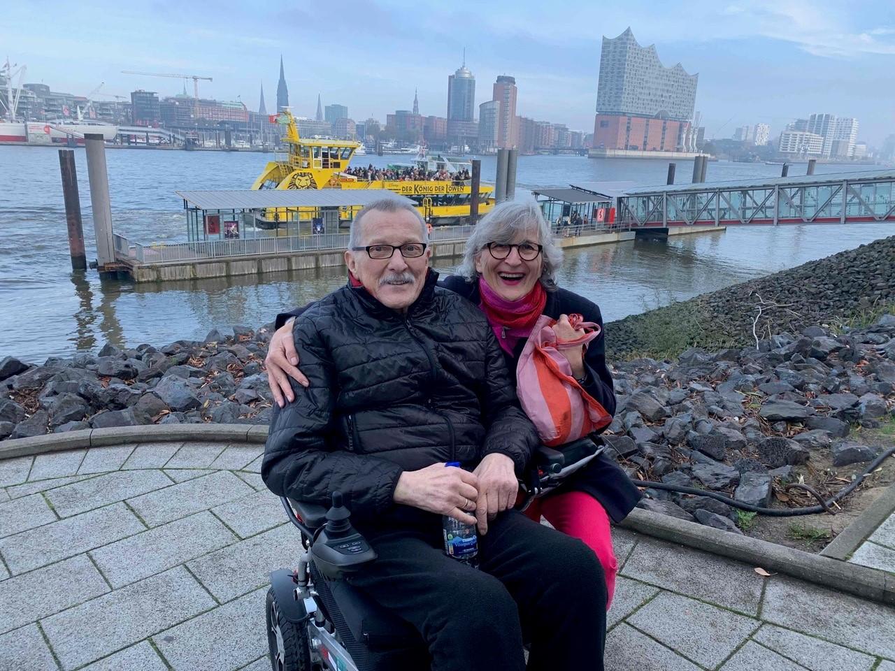 Besonders liebt er Musik. Früher sang er in verschiedenen Chören, erlebte das „Phantom der Oper“ am Broadway und kann es kaum erwarten, heute das Musical in Hamburg zu sehen. Gegen 14:00 Uhr erreichen wir den Parkplatz beim „König der Löwen“. Bettina ist bereits da und freut sich, ihren Onkel zu treffen. Das Wetter ist fantastisch und beschert uns eine herrliche Aussicht auf Hamburg mit der Elbphilharmonie, dem Michel und der Altstadt – ein rundum perfektes Bild.