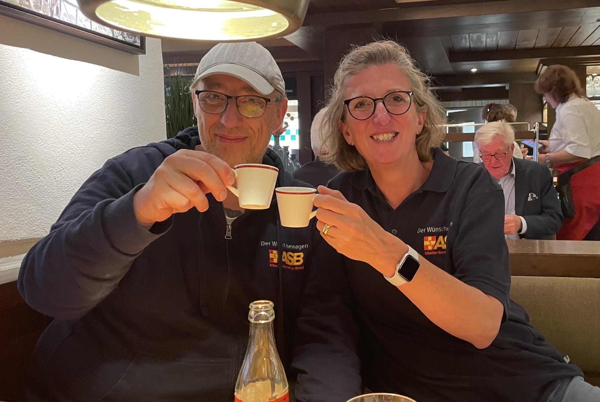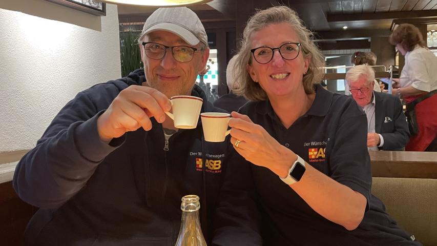 Gut gestärkt ging es zurück zu unserem Wünschewagen, der uns ins legendäre Riders Café brachte. Dort wurden wir schon vom Inhaber erwartet, denn für Rigo und seine Frau sowie uns Begleitende sollte der Einlass vor dem offiziellen Publikum stattfinden. Als Überraschung gab es nämlich noch ein kleines Zusammentreffen mit dem Sänger der Band Kuult! Die Texte der Lieder hatten die beiden durch die schwersten Zeiten gebracht, als unklar war, wie und ob Rigo auf der Intensivstation überleben würde. Es war ein großer Herzenswunsch, gemeinsam das Konzert zu erleben, denn nach fast 30 Jahren Beziehung hatten sie noch nie ein Konzert gemeinsam besucht.