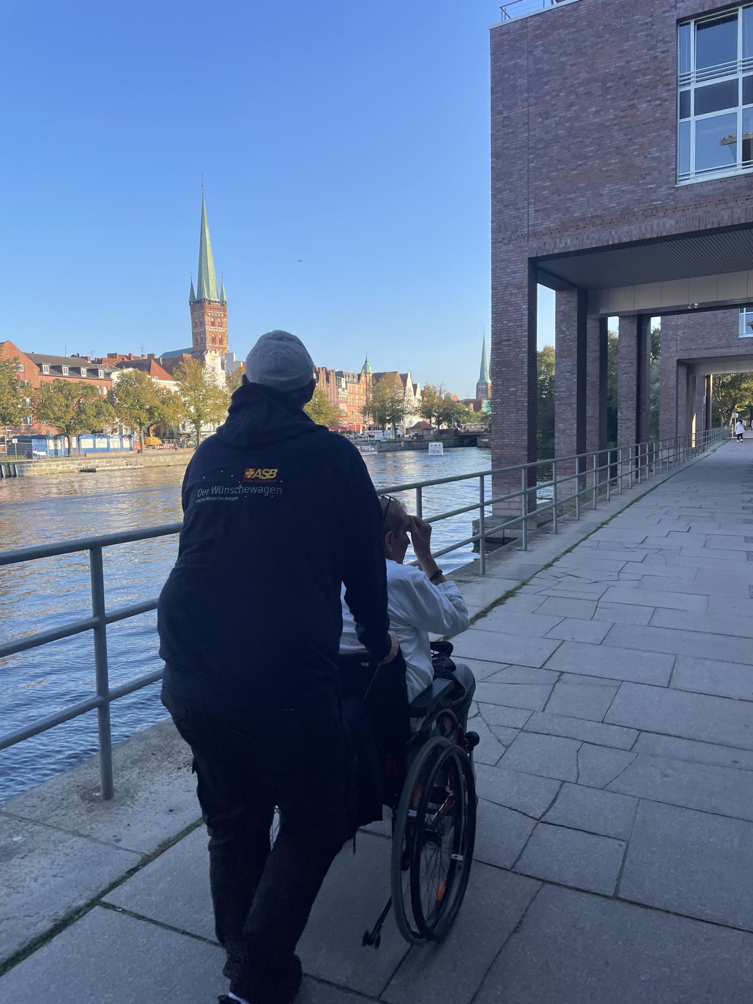 Mit leichter zeitlicher Verspätung haben wir Rigo und seine Frau Gaby am Pflegeheim in Ratzeburg begrüßen dürfen. Aufgeregt und voller Freude warteten sie bereits bei strahlendem Sonnenschein auf uns. Wir einigten uns auf ein unkompliziertes „Du“ und los ging die Reise. Rigo hat auf unserem bequemen Sitz im Auto Platz genommen, sein privater Rollstuhl wurde mitgenommen. Seine Frau Gaby saß ihm gegenüber, und die beiden zwinkerten sich zu. Die Stimmung war fröhlich, aufgeregt und voller Vorfreude auf den Nachmittag und Abend.
