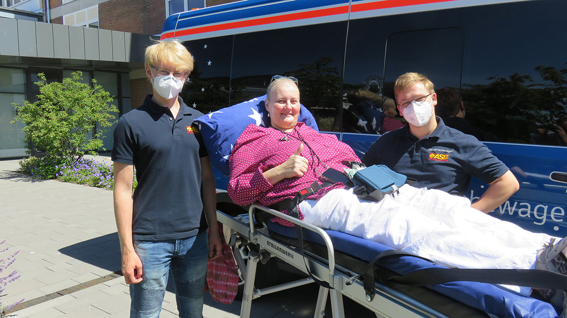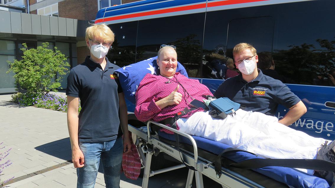 Voller Vorfreude ging es bei strahlendem Sonnenschein mit ihrem Sohn und den ASB-Wunscherfüllern Tobias und Jonas nach Plön ins Berufsbildungszentrum, wo die Aula schon für die Feierlichkeiten vorbereitet war. Mit freundlicher Erlaubnis der Schulleitung durfte die Gruppe den Wünschewagen direkt vor dem Haupteingang abstellen, sodass der Weg zum Veranstaltungsraum nicht weit war. Dort konnte Frau K. dann gemeinsam mit ihrem Sohn, der als Begleitung im Wünschewagen dabei war, mit allen Anwesenden zusammen lachen, die Reden der Schülerinnen und Schüler anhören, die vorbereiteten Diashows mit Bildern der vergangenen Schuljahre ihrer Tochter anschauen und schließlich den wichtigsten Moment des Tages feiern – den Augenblick, in dem ihre Tochter ihr Abi-Zeugnis in den Händen hielt. Herzlichen Glückwunsch!