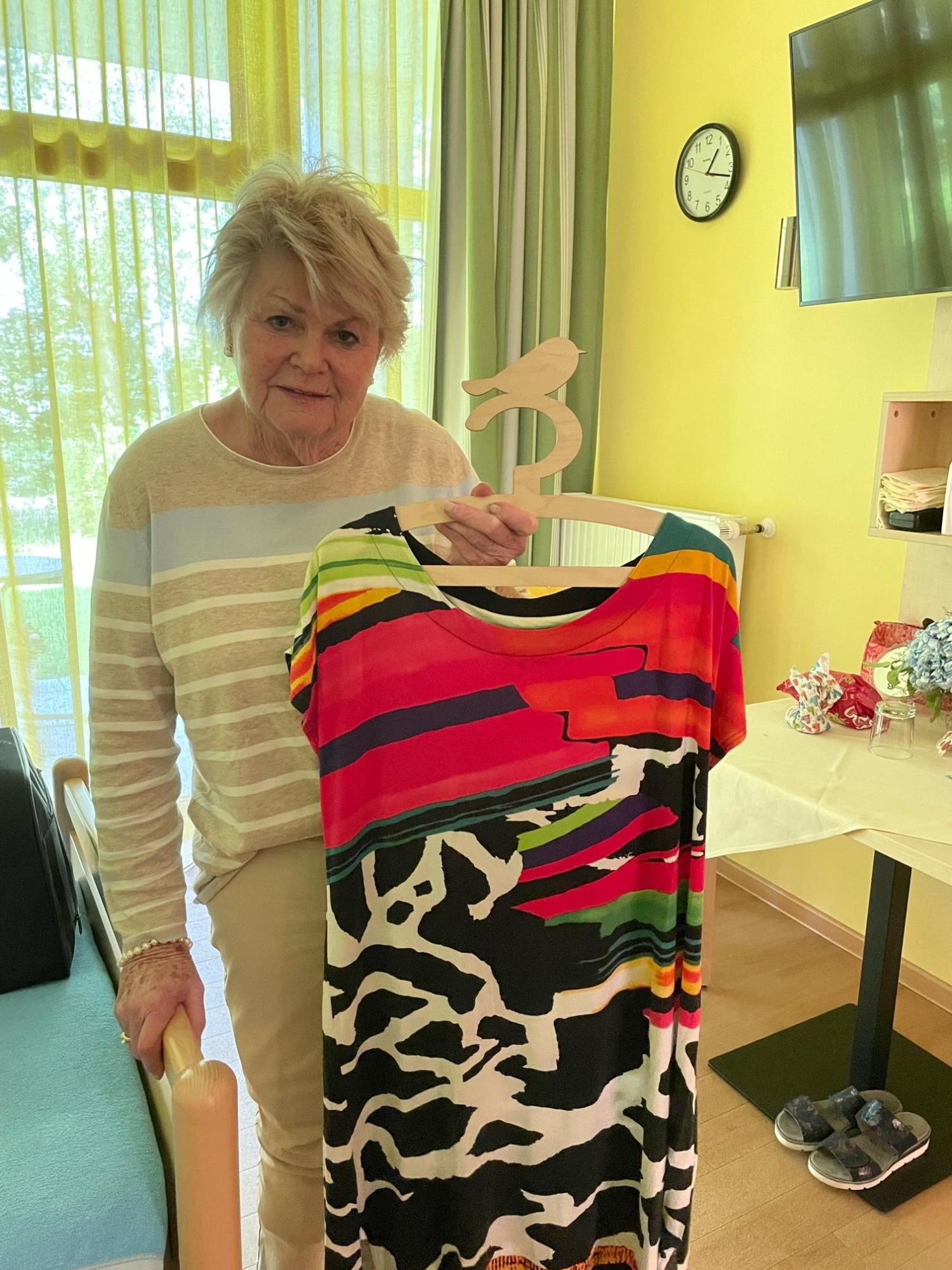 Bevor Lara und ich uns verabschiedeten, teilte Frau N. uns das "Geheimnis des Kleiderbügels mit Vogel" mit. Sie zeigte uns den Bügel, an dem ein wunderschönes, buntes Sommerkleid hing, das sie sich als letzte Kleidung ausgesucht hat. "Am Ende wird die Seele wie ein Vogel davonfliegen!", ist sie überzeugt.
