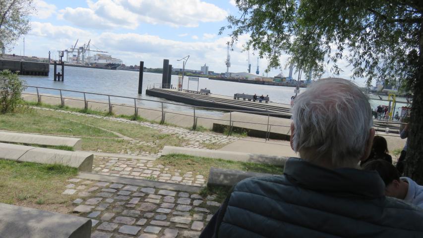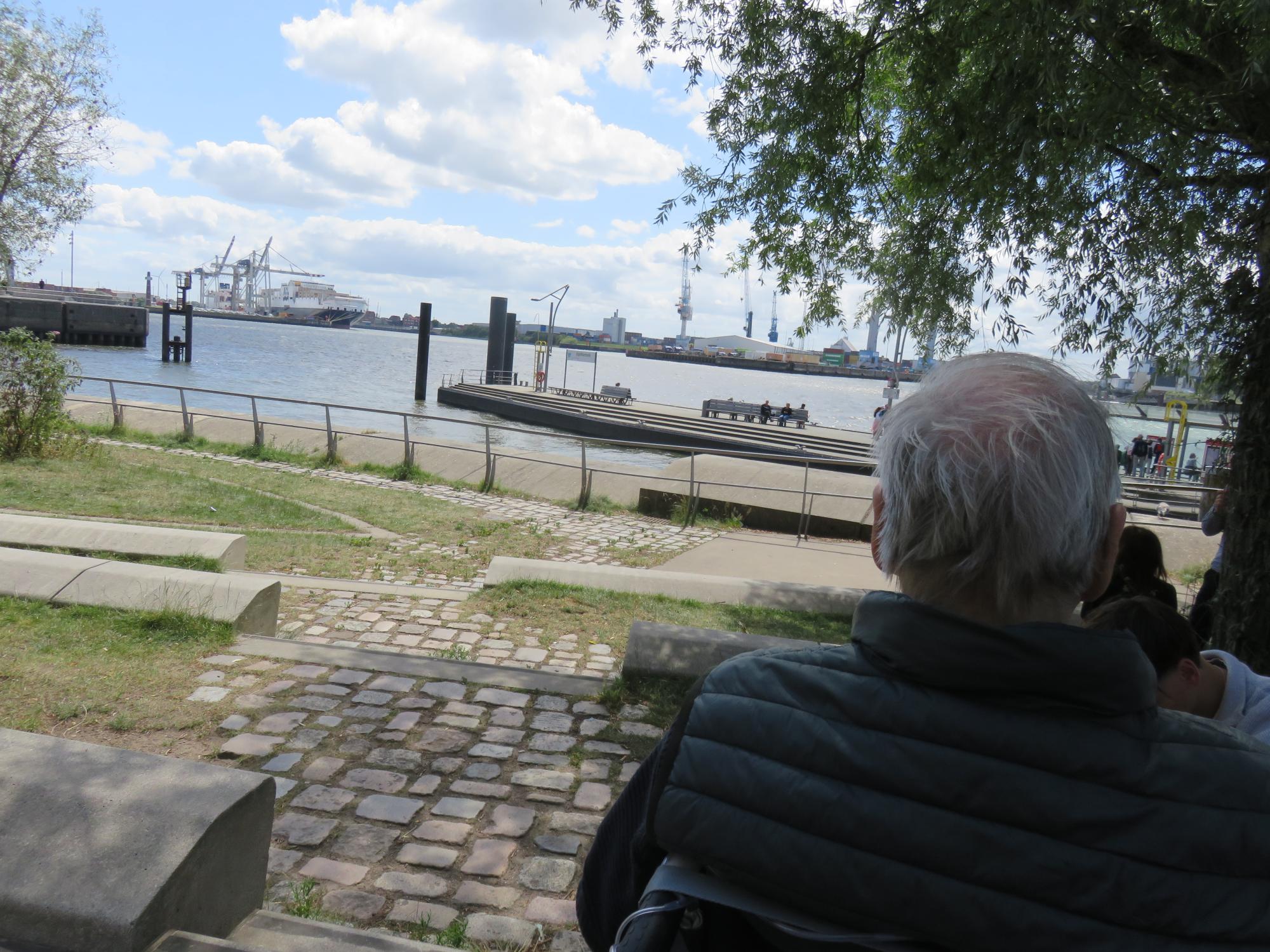 Zwischendurch überlegte die Familie, ob wir in ein Fischrestaurant einkehren sollten – etwas Besonderes sollte es eigentlich werden. Doch Hansi hatte eine andere Idee: Er wünschte sich eine einfache Currywurst. Also ging es weiter zu den Landungsbrücken. Mit Blick auf die Elbe genoss Hansi seine Mahlzeit – unkompliziert, vertraut und ganz nach seinem Geschmack.