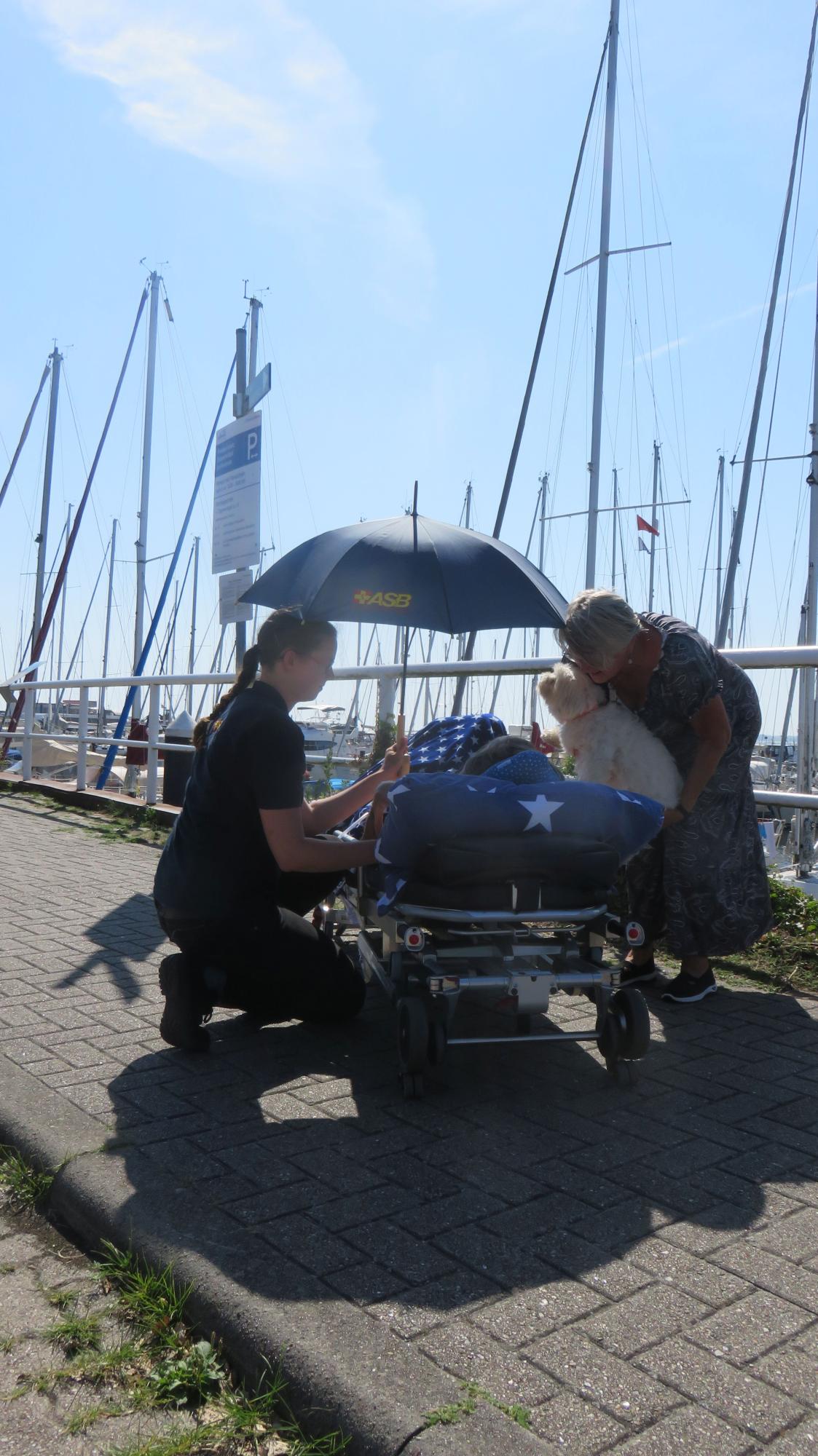 Anschließend ging es weiter nach Heiligenhafen, wo Hajo früher gelebt hatte und den dortigen Yachthafen in sein Herz geschlossen hatte. Hier war die Stimmung besonders emotional, denn Marga war sichtlich aufgewühlt. Sie wich keinen Moment von Hajos Seite. In einem sehr bewegenden Augenblick beugte sie sich liebevoll über ihn, umarmte ihn fest und kämpfte mit den Tränen – der bevorstehende Abschied lag spürbar in der Luft. Auch der kleine Hund schien die besondere Stimmung zu spüren, denn er lief ständig zwischen Frauchen und Herrchen hin und her.