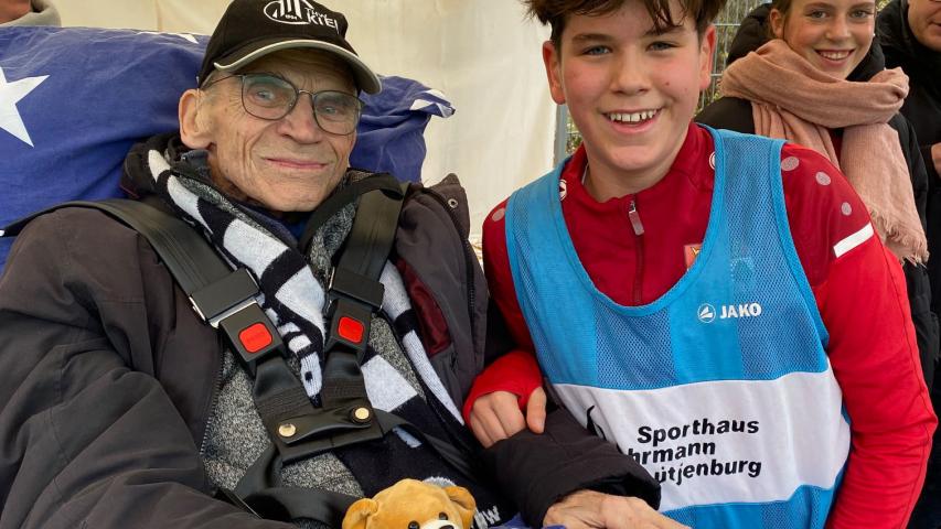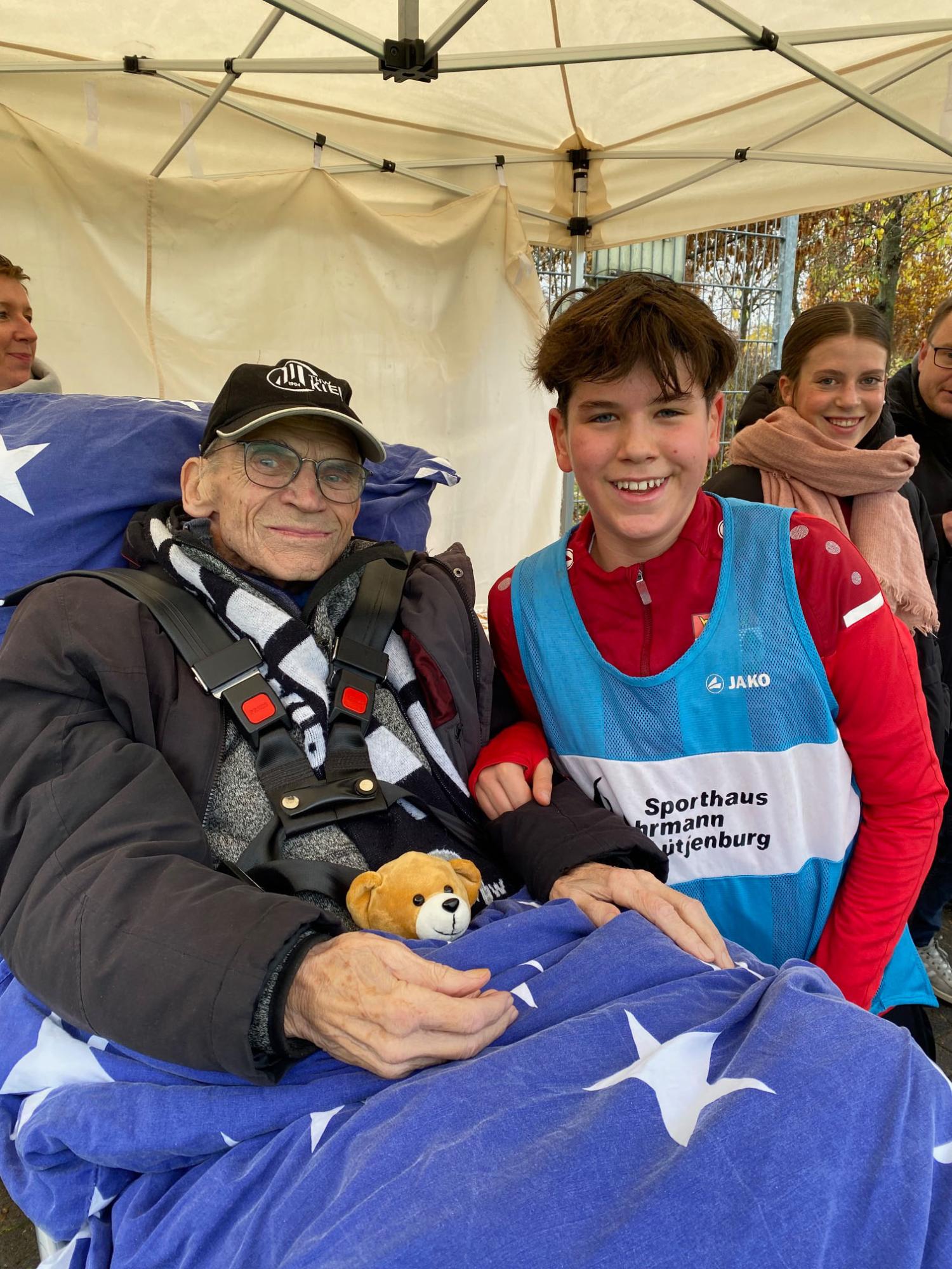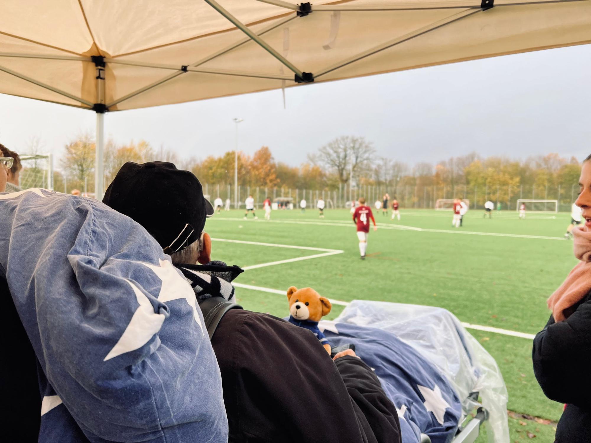 Nach einer herzlichen Begrüßung und einem flotten Spruch seitens unseres Fahrgastes ging es zum nahegelegenen Sportplatz nach Kronshagen bei Kiel. Gut geschützt unterm Zelt und warm in unsere Decke eingepackt bekam Ehren-Fan Herr M. einen Logenplatz. Nicht sein Stammplatz, den er bei jedem Spiel von Enkel Lasse eingenommen hatte, aber exklusiv für ihn.