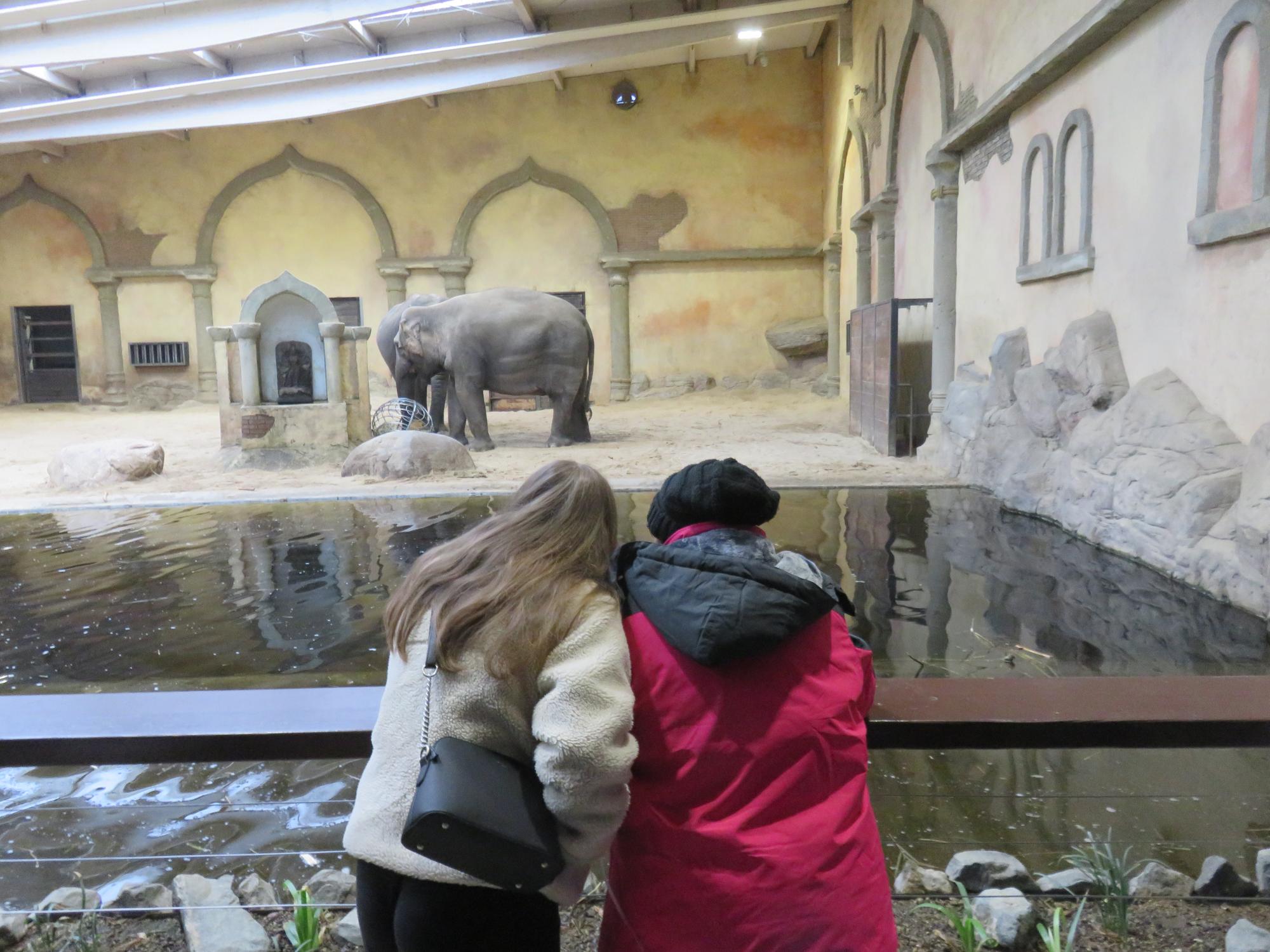 Am Tierpark angekommen, wartete bereits der Rest der Familie auf uns. Gemeinsam starteten wir unseren Rundgang, und als Erstes standen die Elefanten auf dem Programm. Aufgrund des Wetters befanden sie sich im Elefantenhaus, wo wir beobachten konnten, wie sie geschickt das Heu aus einem Stahlgitterball holten, es mit ihrem Rüssel drehten und genussvoll verspeisten.
