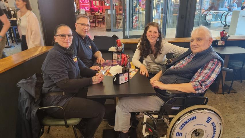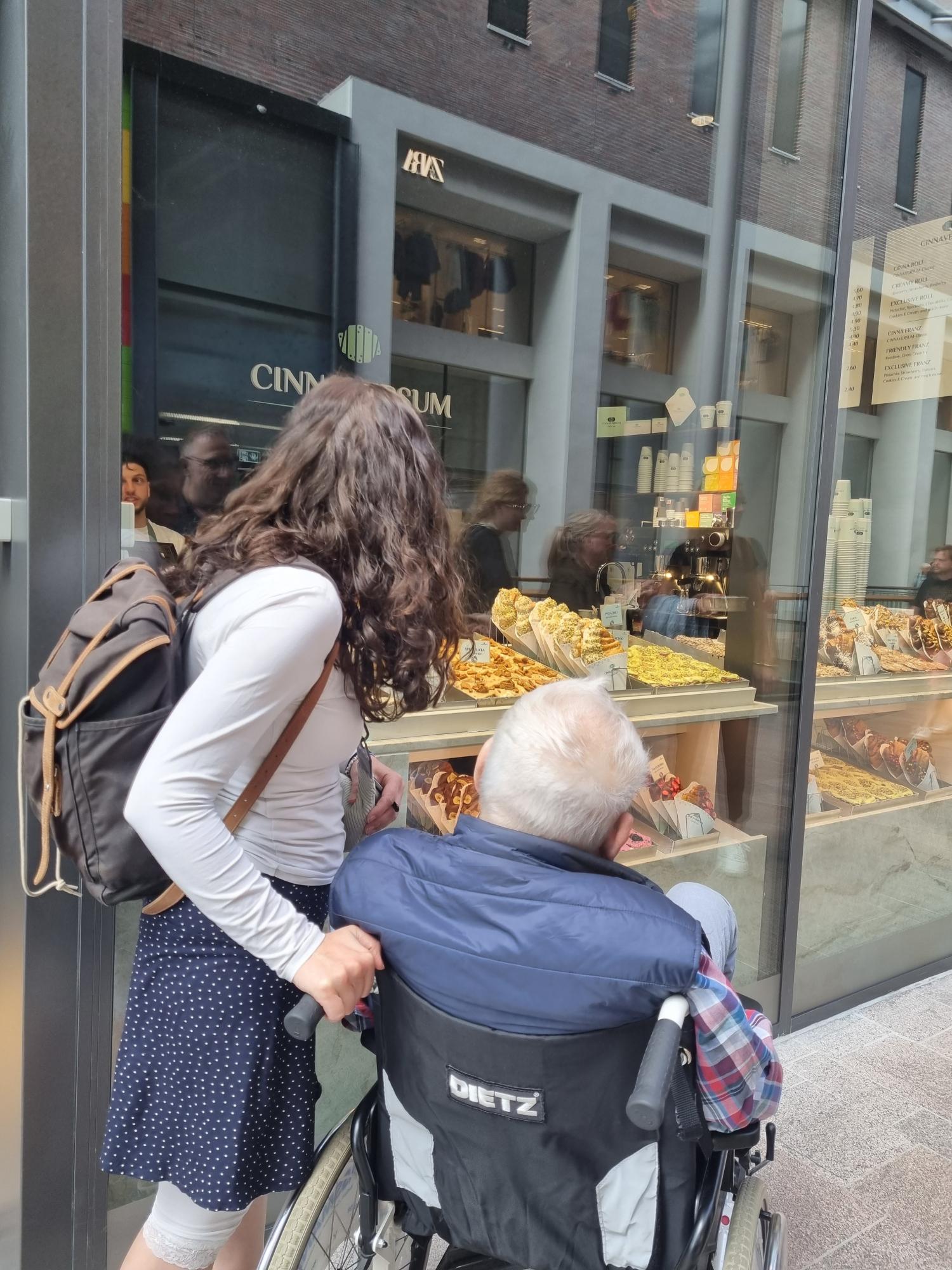 Gesagt, getan. Wir fuhren HG im Rollstuhl an den Geschäften vorbei, blieben an den Schaufenstern stehen und bestaunten die Auslage. Später fuhren wir in die Etage, in der die Restaurants zu finden sind. HG wollte gern chinesisch essen, also suchten wir uns schöne Plätze.