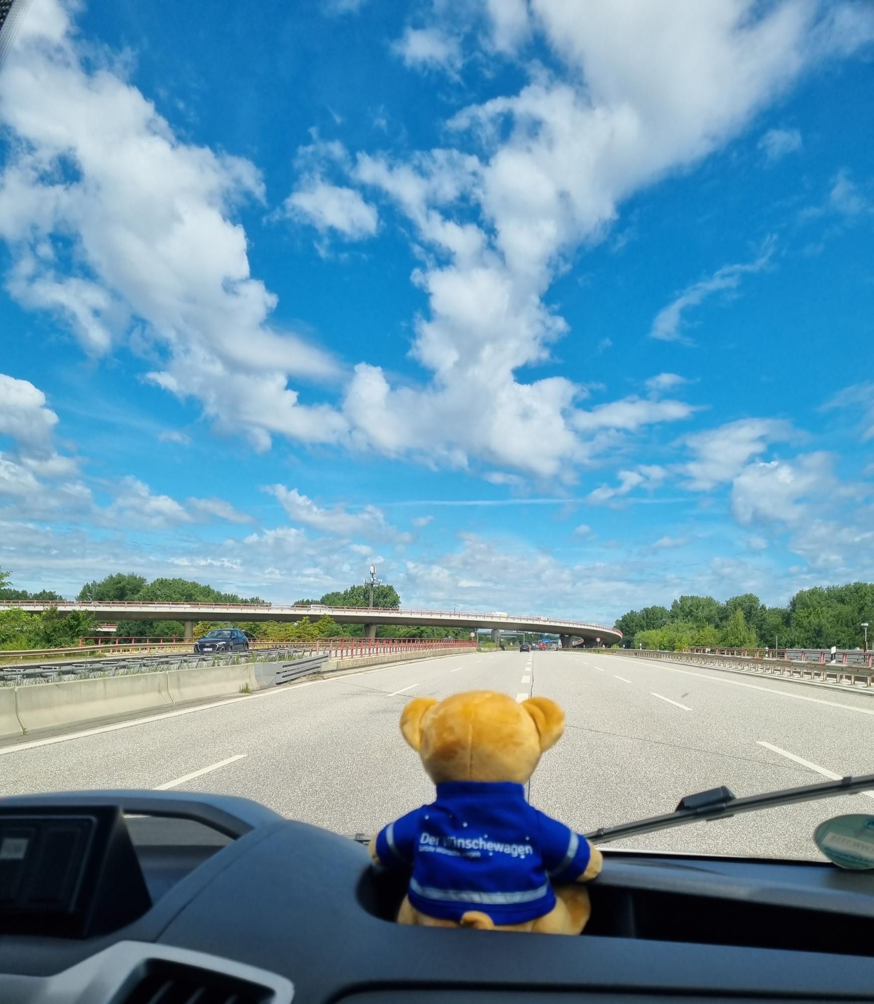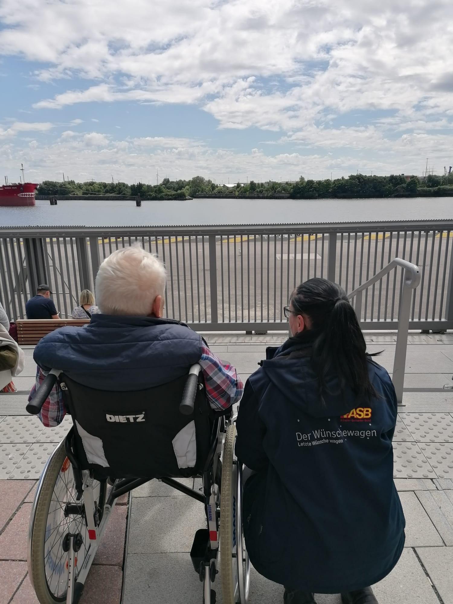 Am Donnerstag, 10.07.25, starteten wir Wunscherfüller, Malte und Mary, Richtung Geesthacht. Dort warteten unser Fahrgast und eine Mitarbeiterin des Hospizes auf uns. Nachdem wir im Hospiz ankamen, wurden wir von Shari, der Begleitung des Fahrgastes, empfangen. Sie führte uns in das Zimmer des Fahrgastes. Die Begrüßung war freundlich und direkt: "Nennt mich HG, das ist kürzer als Hans-Günther." Wir stellten uns ebenfalls vor und gingen dann mit HG und Shari zum Wünschewagen. Nachdem jeder seinen Platz eingenommen hatte, fuhren wir nach Hamburg.