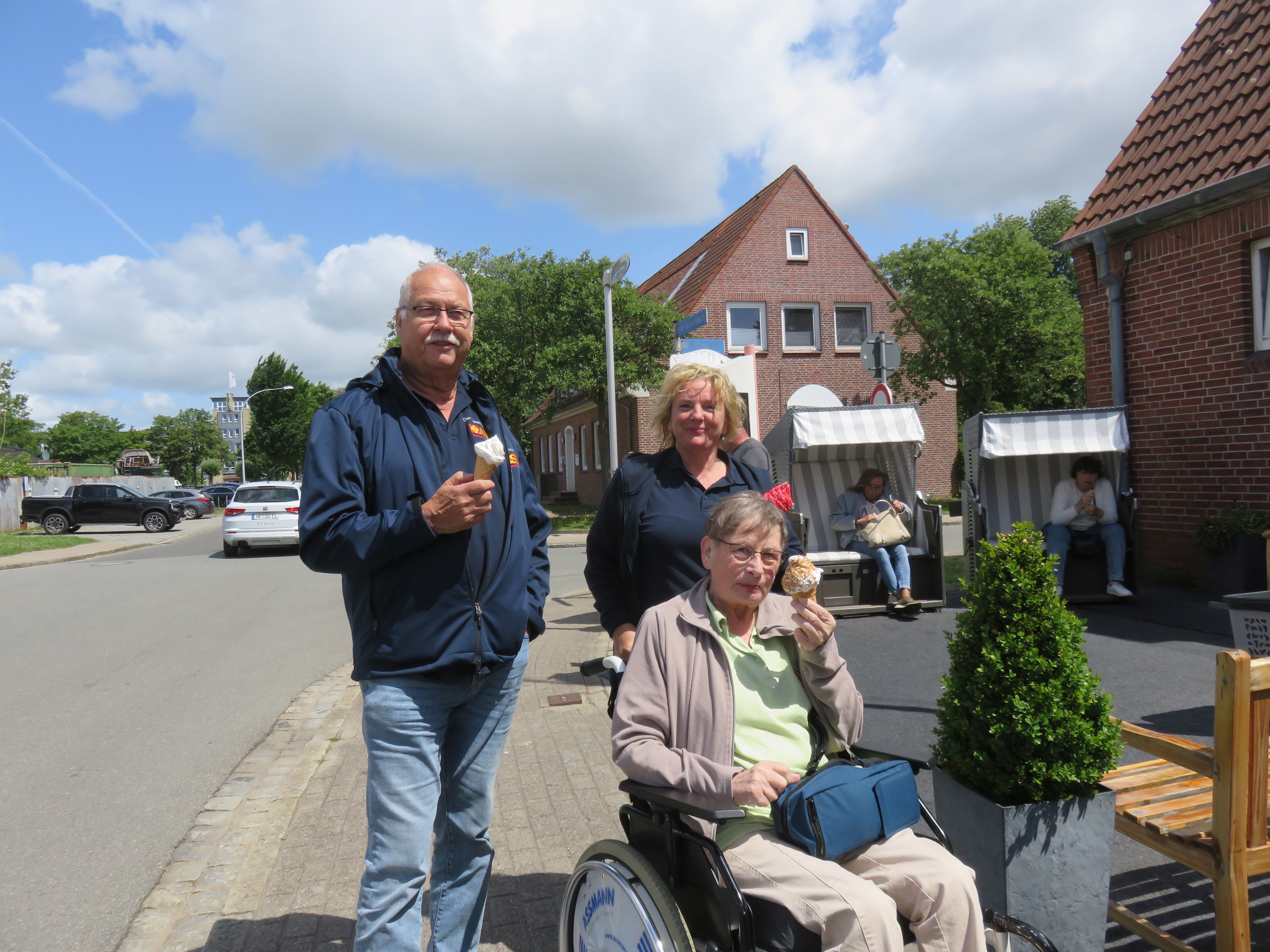 Ellen wurde so warm ums Herz, dass wir es gemeinsam mit einem Eisessen versucht haben, abzukühlen. Nach dem Eis ließ uns der freundliche Mitarbeiter der DGzRS auf deren Gelände unseren Wünschewagen parken, damit Ellen auf der Mole die Nordsee ansehen konnte. Die Luft streichelte ihr Gesicht und wehte durch die Haare.