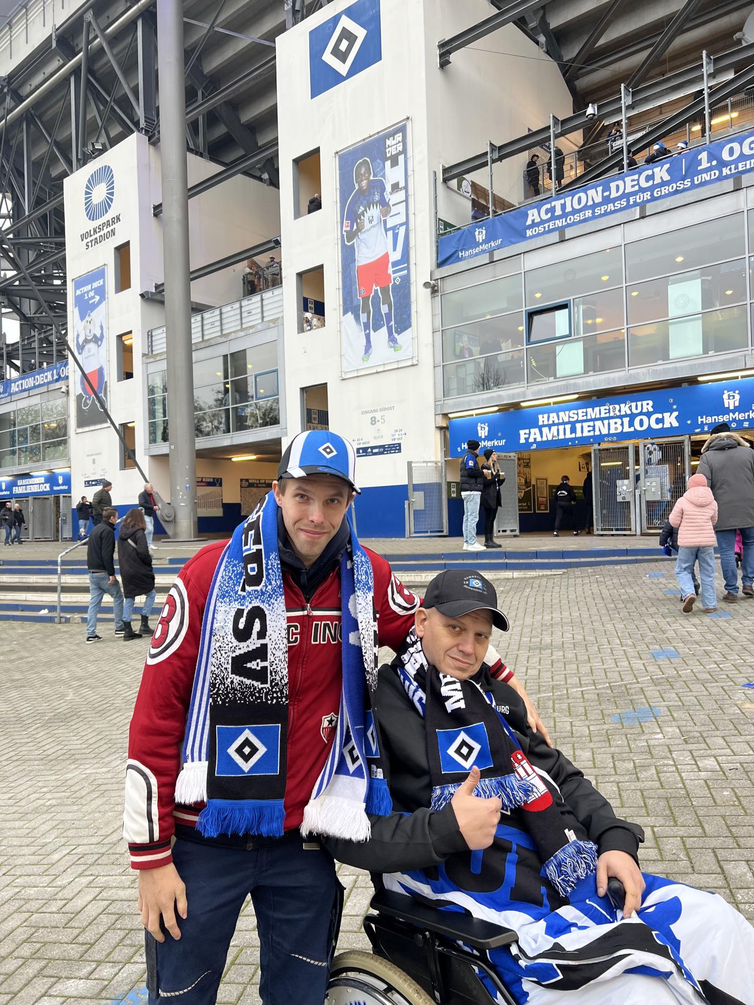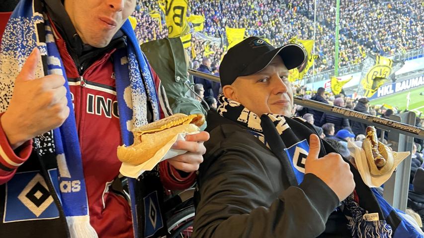 Dennis, eingefleischter HSV-Fan aus Bad Segeberg, hat sich schon die ganze Woche auf das ausverkaufte Spiel gegen die Borussen aus Dortmund gefreut. So machten sich die Wunscherfüller Alex und Lars auf den Weg nach Bad Segeberg, um mit Dennis und seinem Bruder Nils am Samstagnachmittag die Rothosen anzufeuern. Der Wünschewagen wurde natürlich mit HSV-Bettwäsche vorbereitet, sodass die Vorfreude auf ein tolles Spiel groß war. Vor dem Spiel wurden wir sehr nett von dem HSV-Integrationsteam empfangen. Dennis bekam einen Stadionsitz, der von allen Spielern des HSV signiert wurde. Eine tolle Erinnerung und ein tolles Geschenk! Dann der Anpfiff: Dennis und Nils feuerten kräftig, gestärkt nach einer Stadionbratwurst, ihren HSV an. Ein ausgeglichenes Spiel bis zur 64. Minute! Doch dann kassierte der HSV den Gegentreffer. Aber die HSV-Kicker hielten sich wacker und konnten in der 7. Nachspielminute der zweiten Halbzeit einen Ausgleich erzielen. Die Stimmung im Stadion und bei Dennis und Nils war dann natürlich überwältigend. Eine richtig tolle Atmosphäre! Mit diesem guten Gefühl machten wir uns nach dem Schlusspfiff auf den Rückweg nach Bad Segeberg. Sicher feierten die beiden Brüder dann noch den mehr als verdienten Ausgleich ihres HSV.