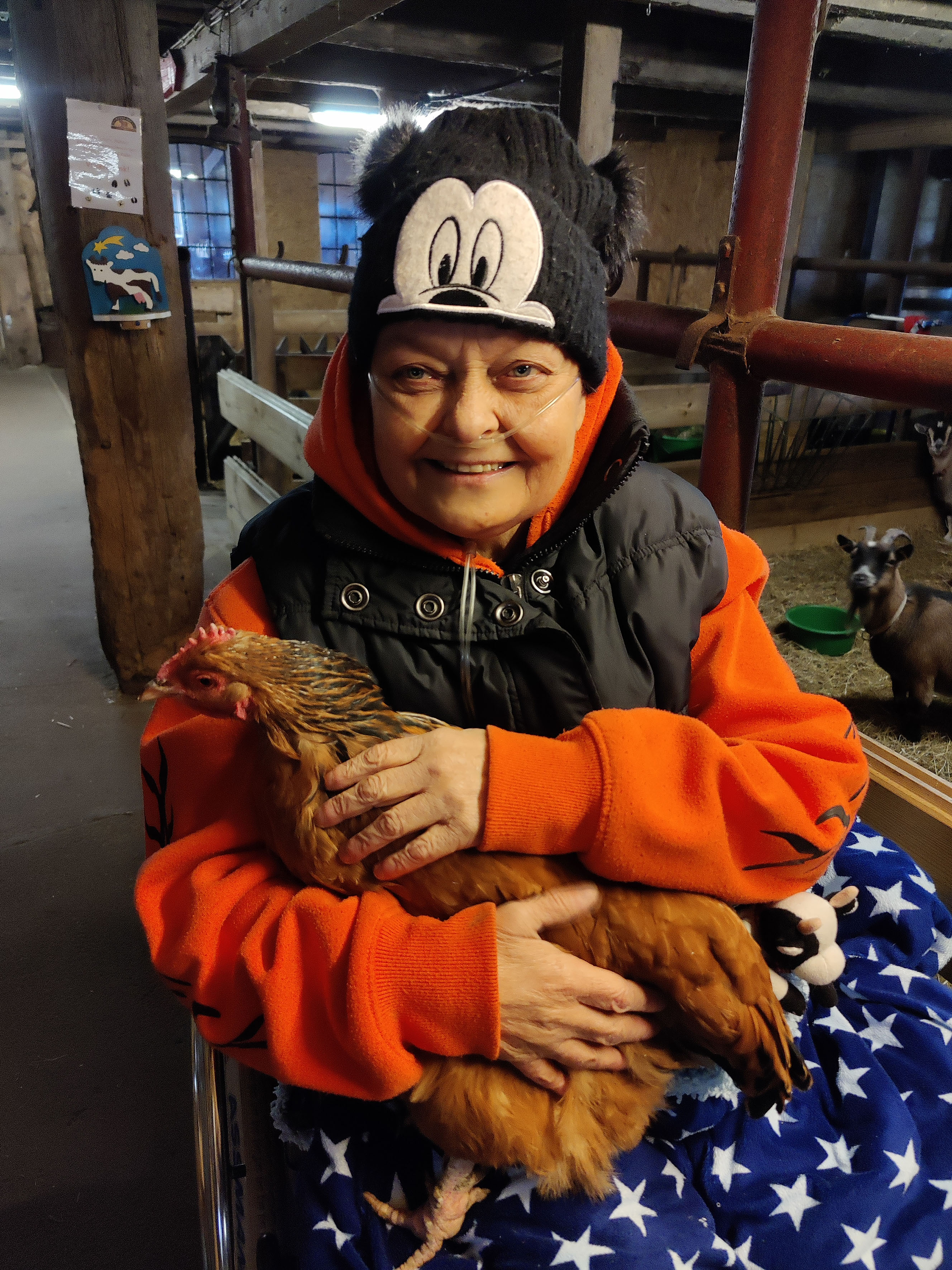 Nach so viel Lachen konnte Tatjana mit dem Huhn Hildegard auf ihrem Schoss kuscheln und wurde mit einem frischen Ei belohnt.