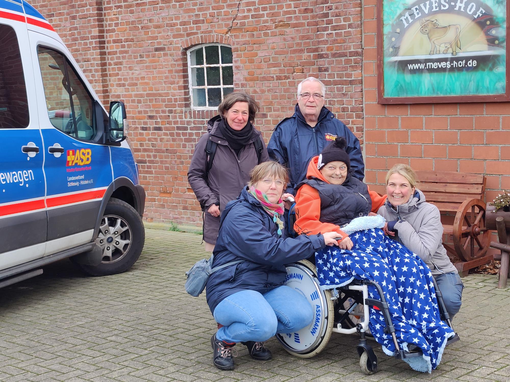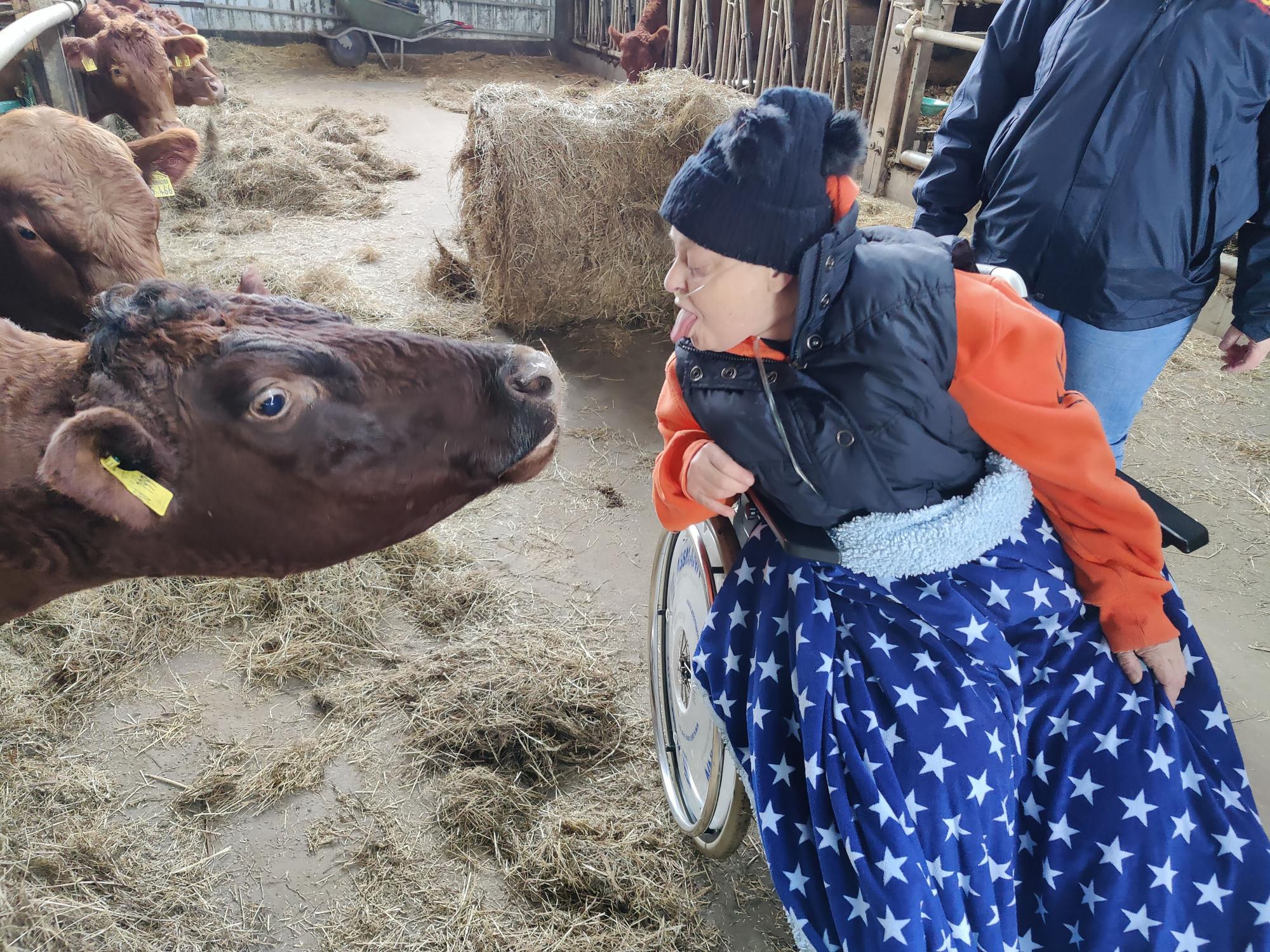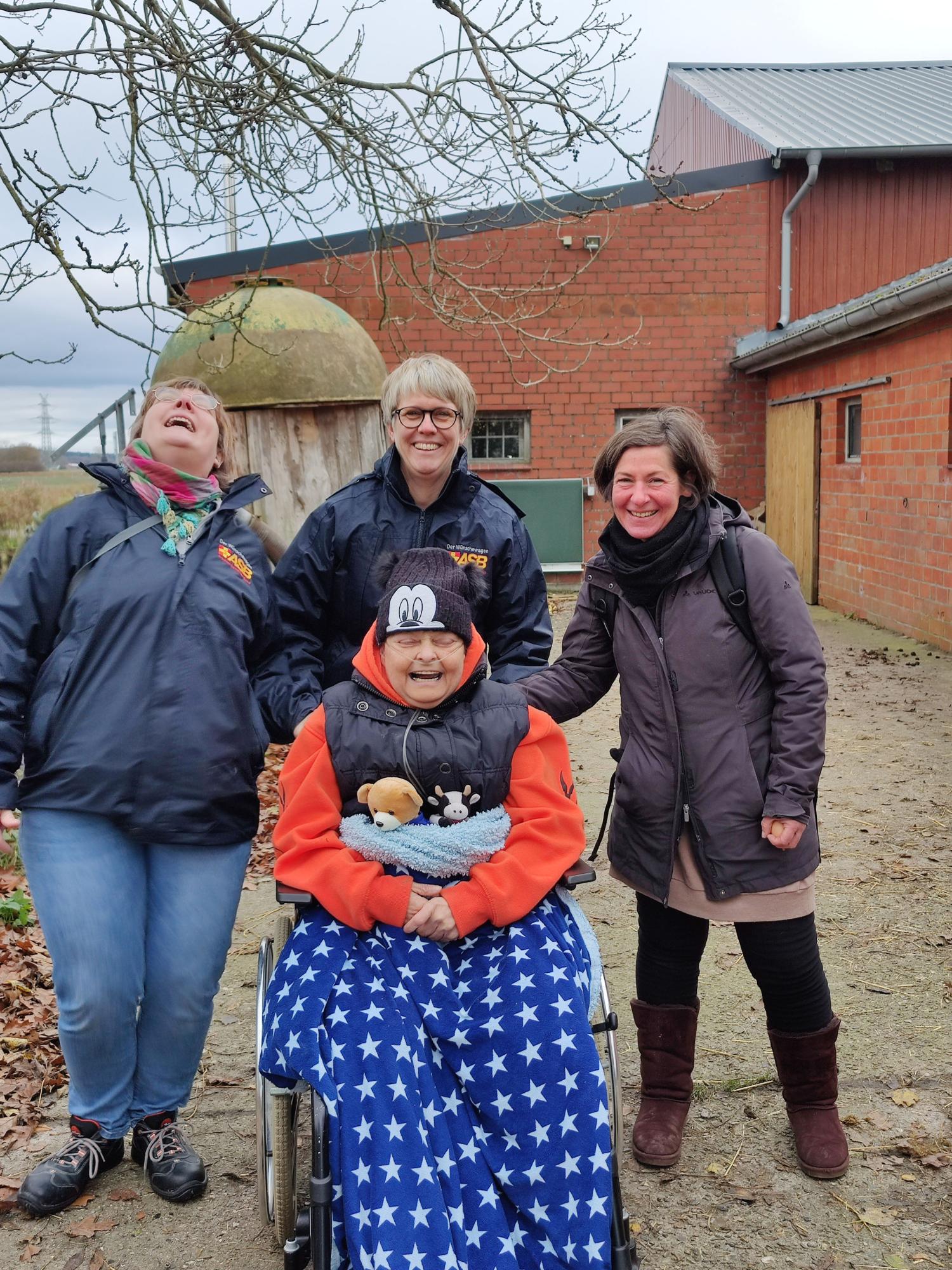 Früh am Morgen machten sich die drei Wunscherfüller:innen Peer, Maike und Ulrike auf den Weg nach Husum, um Tatjana und ihre Begleiterin abzuholen. Wir wurden sehr herzlich empfangen. Alles war schon vorbereitet und wir konnten schon bald unsere Fahrt mit für Tatjana unbekanntem Ziel antreten. Ihr Wunsch lautete, noch einmal in Kontakt mit Tieren zu kommen, insbesondere mit Kühen, da sie in ihrem Berufsleben auch einige Jahre Kühe versorgt hat.