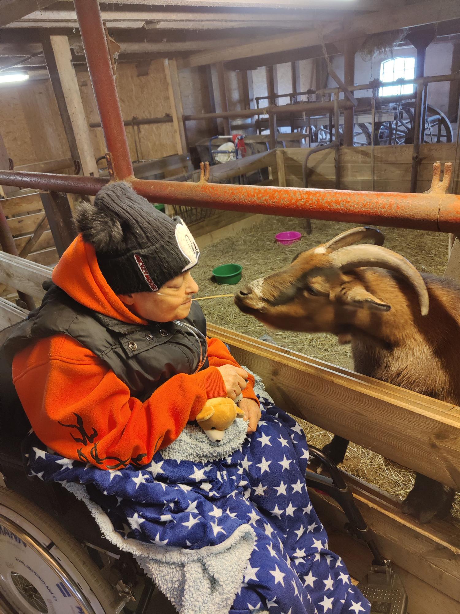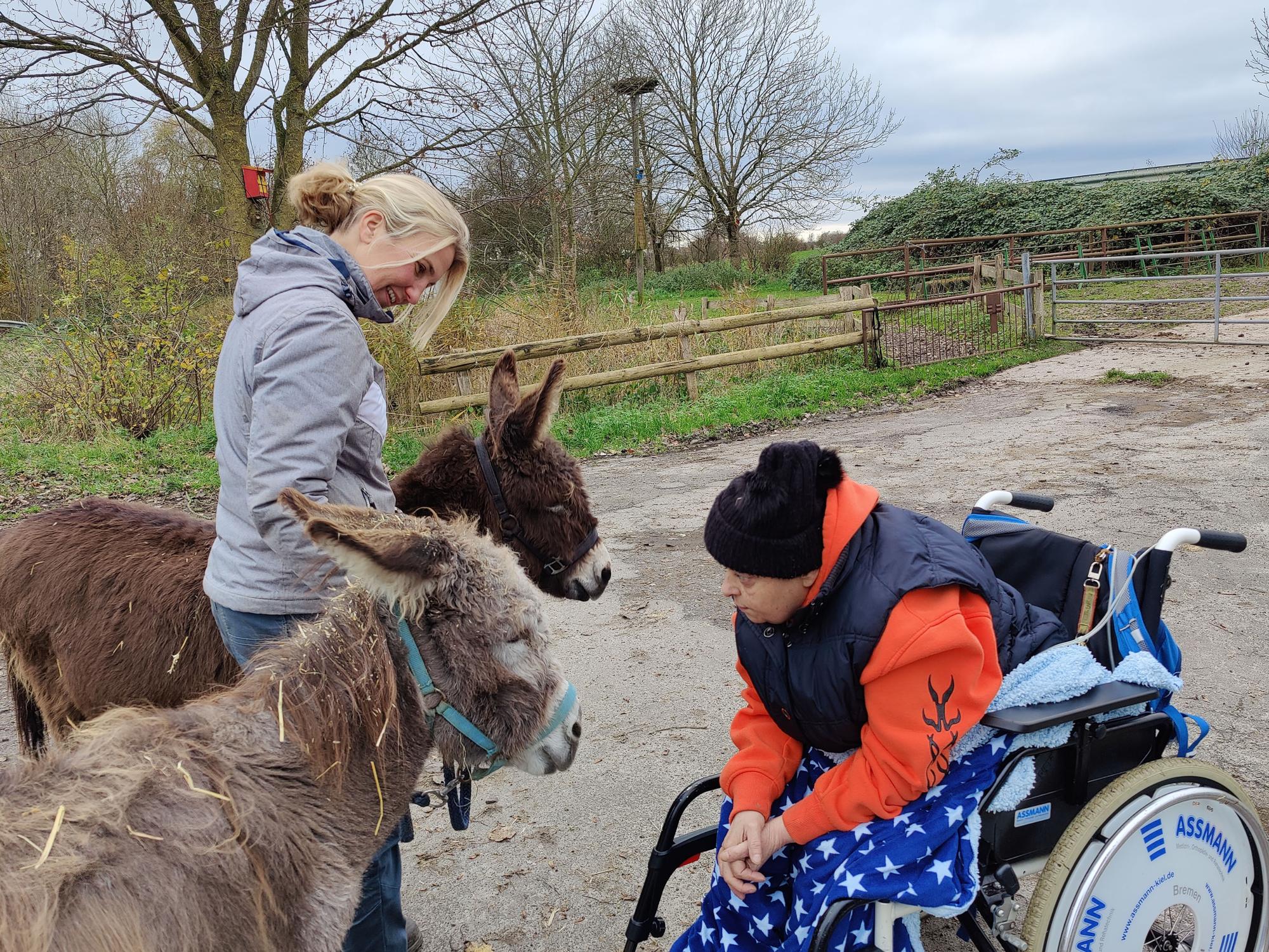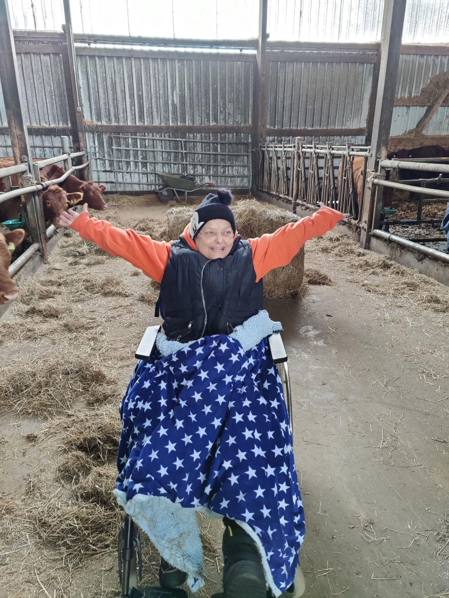 Früh am Morgen machten sich die drei Wunscherfüller:innen Peer, Maike und Ulrike auf den Weg nach Husum, um Tatjana und ihre Begleiterin abzuholen. Wir wurden sehr herzlich empfangen. Alles war schon vorbereitet und wir konnten schon bald unsere Fahrt mit für Tatjana unbekanntem Ziel antreten. Ihr Wunsch lautete, noch einmal in Kontakt mit Tieren zu kommen, insbesondere mit Kühen, da sie in ihrem Berufsleben auch einige Jahre Kühe versorgt hat.