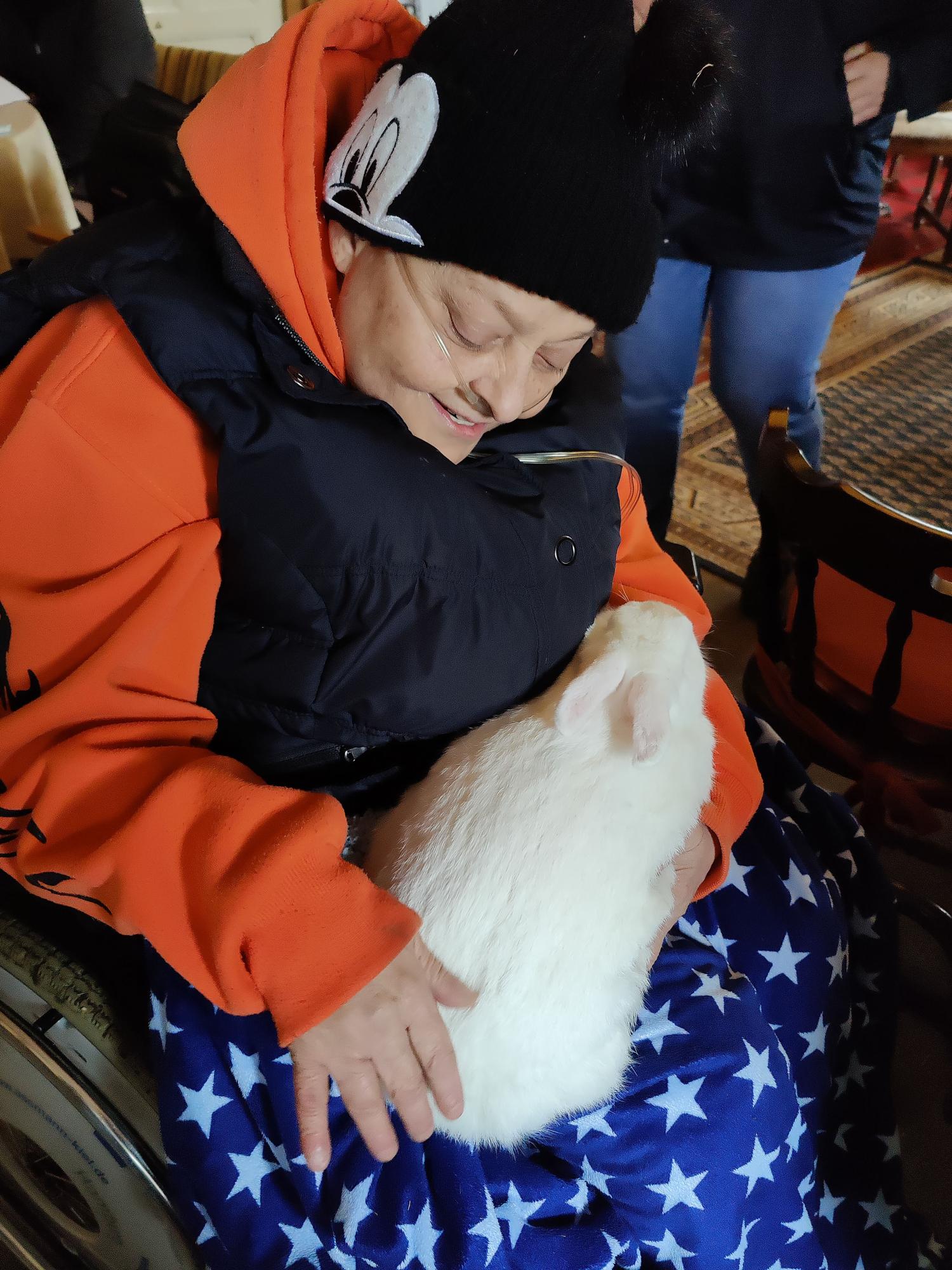 Nach dem Kuhstall ging es noch ein kleines Stückchen mit den Eseln Marielou und Janka an der Leine Richtung Weide, bevor wir uns auf den Weg zurück in die Scheune machten, wo wir uns am warmen Bollerofen ein wenig aufwärmten und Tatjana mit „Schneeflocke“ auf dem Schoß ganz versunken das weiche, warme Fell des Kaninchens genoss.