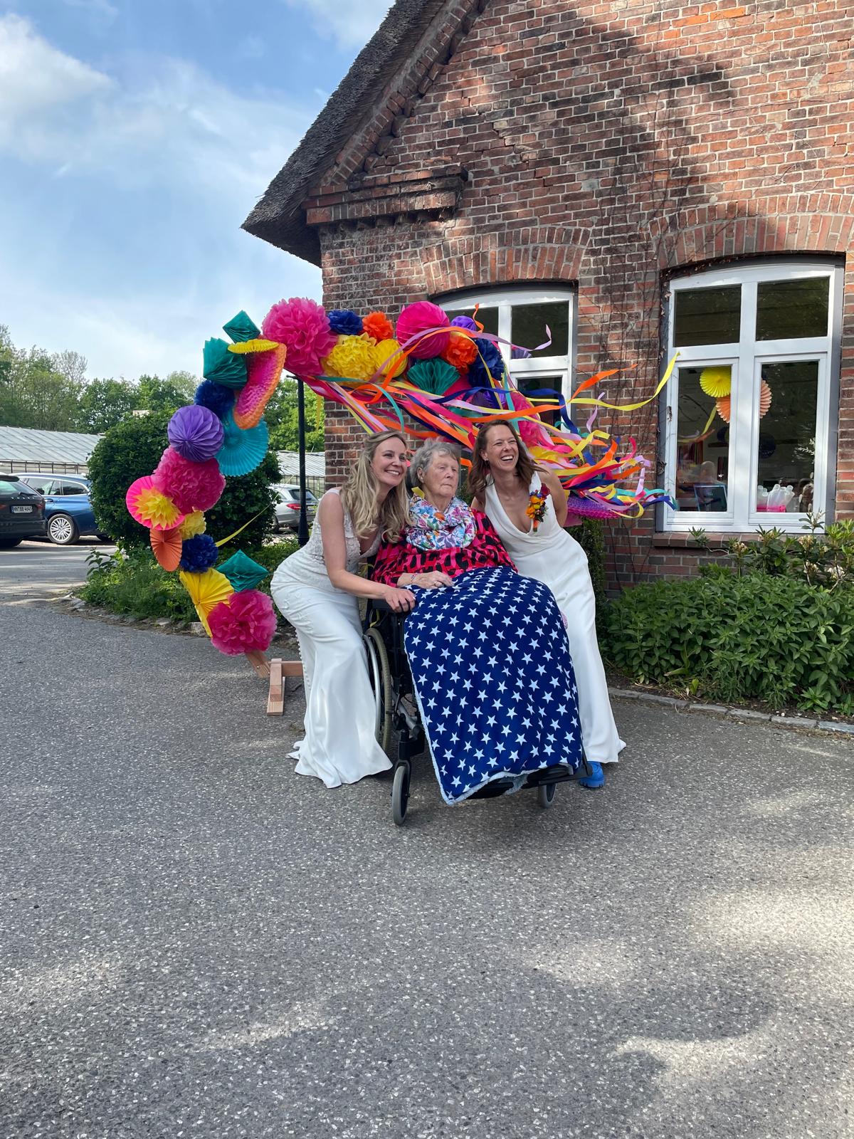 „Liebe ist bunt!“ ist das Motto der Hochzeit – und es hätte nicht schöner umgesetzt werden können. Strahlender Sonnenschein, Gäste in wunderschöner, bunter Kleidung und ein liebevolles Eheversprechen von Lara und Jasmin. Die Musiker, die in jeder Hinsicht den richtigen Ton getroffen haben, spielten begleitend zum Ja-Wort „Wenn nicht für immer, dann wenigstens ewig“, von Peter Maffey, ein ganz besonderer Moment, der noch besonderer wurde, als Karin laut und deutlich in die Zeremonie reingerufen hat: „Und ich bin ja auch noch für Euch da!“.
