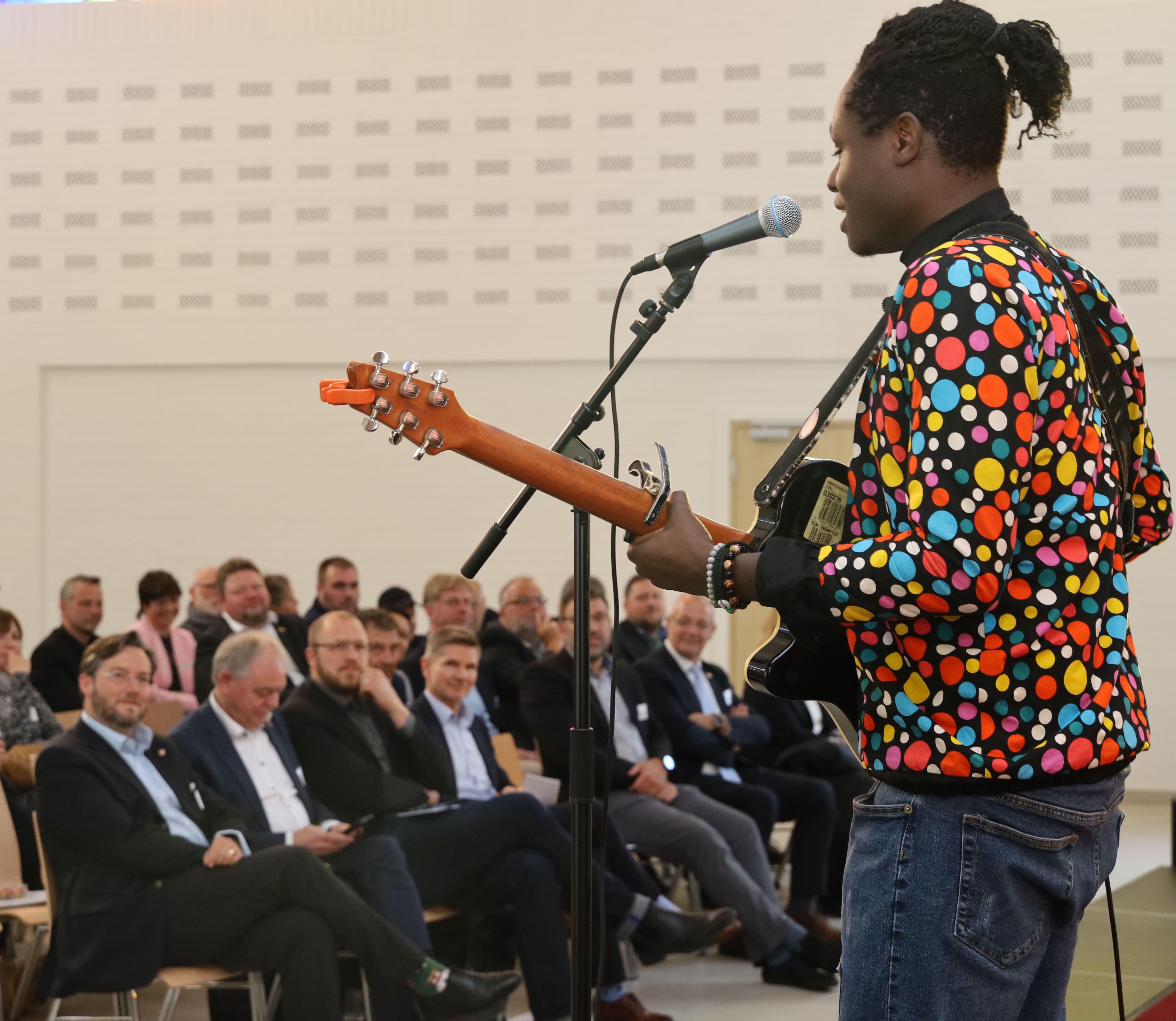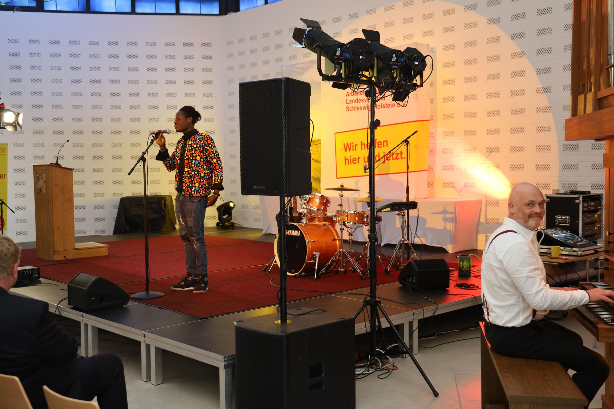 Rund wurde der Frühjahrsempfang nicht zuletzt dank der künstlerischen und kulinarischen Zutaten. Für Letzteres zeichnete das „Chili event house“ aus Itzehoe auf schmackhafteste Weise mit einem „Flying Buffet“ zuständig, Takte und Töne steuerten Jens Petersen an der Orgel und am Piano sowie Ezé Wendtoin bei. Wendtoin, in Burkina Faso geboren und studierter Germanist, erwies sich dabei als amüsanter und erfrischend (selbst-)ironischer Brückenbauer zwischen den Kulturen und Kontinenten. Als „Mensch mit Migrationsvordergrund“ fragte er sich gleich am Anfang augenzwinkernd: „Bin ich der einzigste hier, wo kein Deutsch kann?“ – und hatte sein Publikum auch schon um den Finger gewickelt.