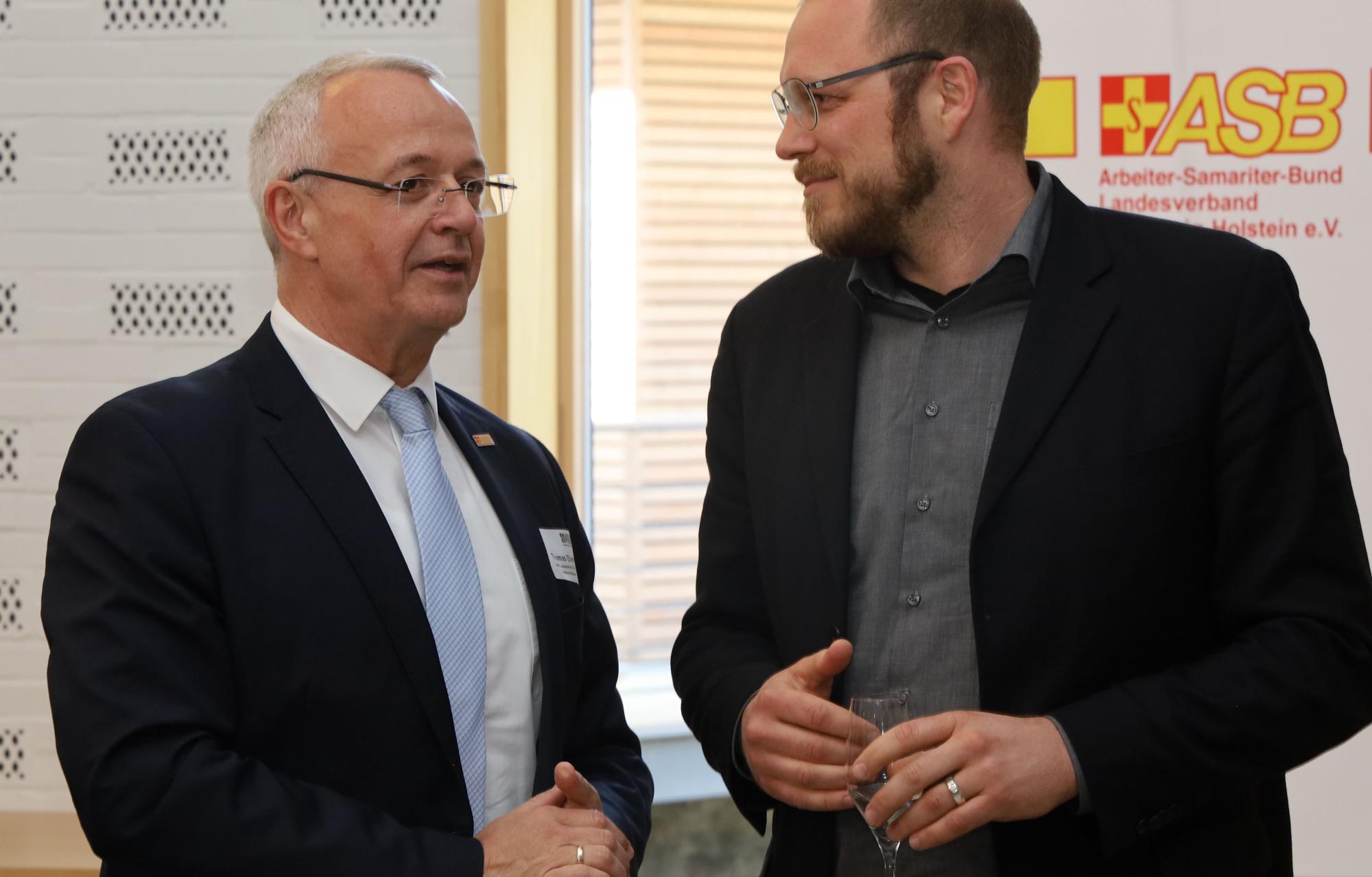 Im Heptagon am Hospiz St. Klemens begrüßte Landesvorsitzender Thomas Elvers viele engagierte Ehren- und Hauptamtliche des ASB, aber auch Vertreterinnen und Vertreter von Wirtschaft, Gesellschaft, Kirche und Politik. Mit Otto Carstens (Justizministerium), Jörg Sibbel (Innenministerium) und Johannes Albig (Sozialministerium) waren gleich drei Staatssekretäre dabei. Und selbstverständlich zeigten Martin Kayenburg, der Präsident des ASB Schleswig-Holstein, der stellvertretende Bundesvorsitzende Uwe Borchmann sowie viele weitere Stützen des ASB Präsenz in Itzehoe.
