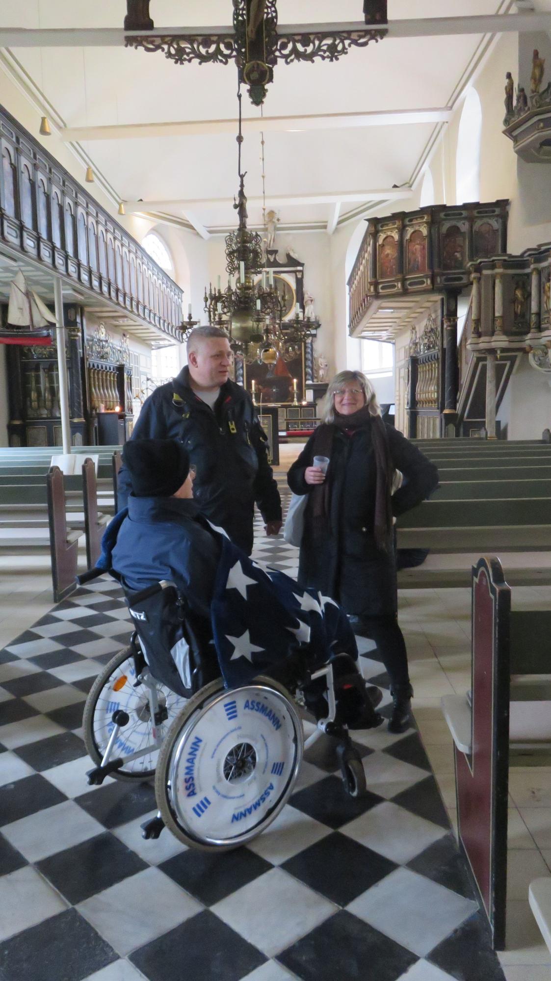 Dort angekommen, konnten wir mit unserem Wünschewagen direkt auf dem Marktplatz parken und zum ersten Ziel spazieren: dem Wochenmarkt. Herr R. wollte sich unbedingt sein Lieblingsbrot vom Bäcker mitnehmen und seiner Frau einen Blumenstrauß schenken. Außerdem gab es den ersten Glühwein in diesem Winter mit einer leckeren Currywurst für unseren Fahrgast. Kurzerhand gingen wir danach in die angrenzende Kirche, unterhielten uns nett für einige Zeit mit der Pastorin und konnten uns zudem von der Kälte ein wenig in der Kirche aufwärmen.