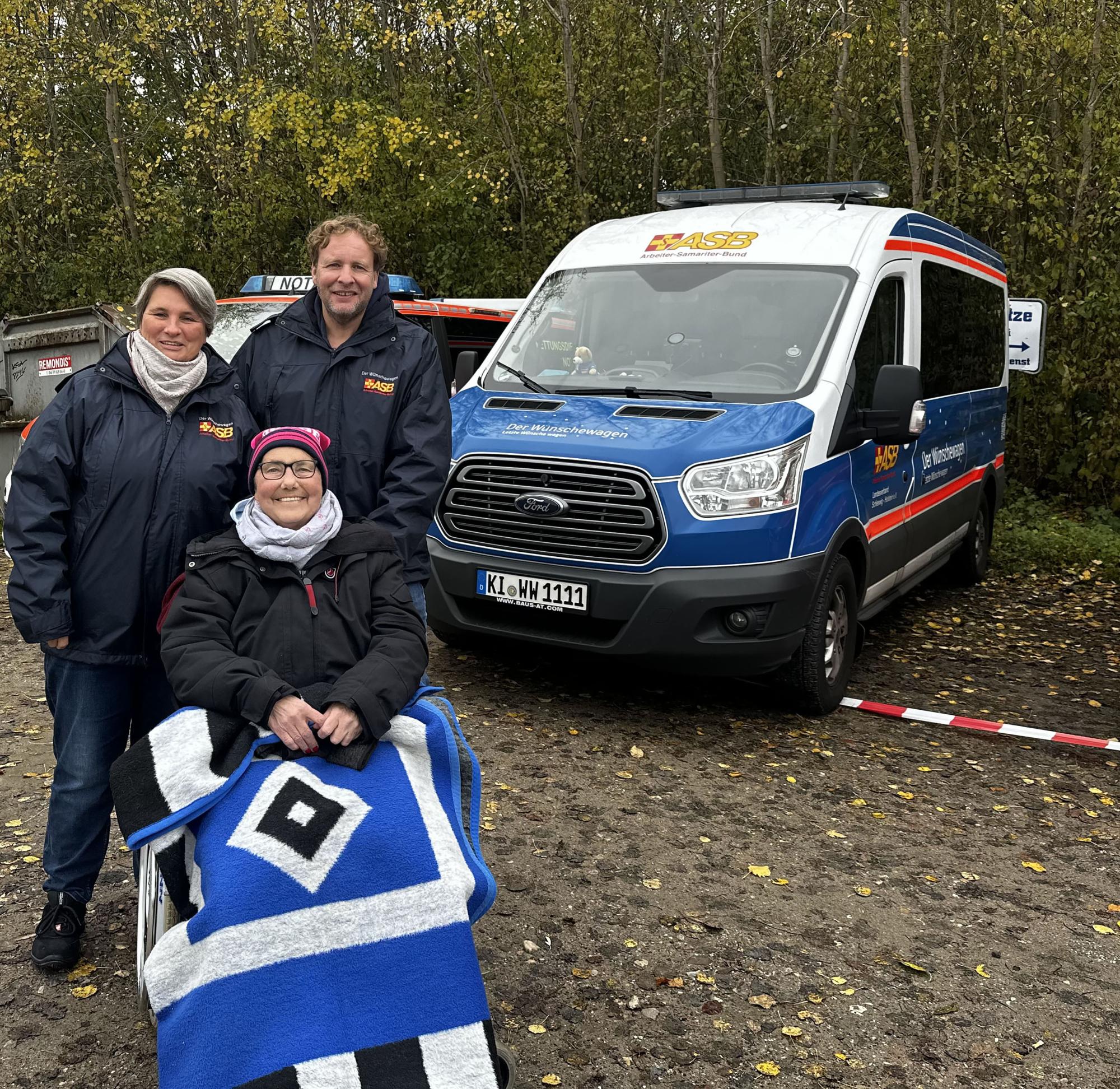 Diesen Wunsch hatte Conny auf dem Zettel. Ihre Tochter Mella kontaktierte das Wünschewagen-Team. Wie es der Zufall wollte, stand das Auswärtsspiel gegen Holstein Kiel am 11. November auf dem Spielplan des HSV – nicht weit entfernt also von dem Hospiz Haus Porsefeld in Rendsburg, in dem Conny wohnt. Von dort starteten die Wunscherfüller:in Manuela und Lars gemeinsam mit Conny und ihrer Tochter Mella in Richtung „Kieler Störche“. Conny hatte sich mit ihrer HSV-Fankluft so richtig in Schale geworfen, und ein kleines Spalier entließ sie aus dem Hospiz.