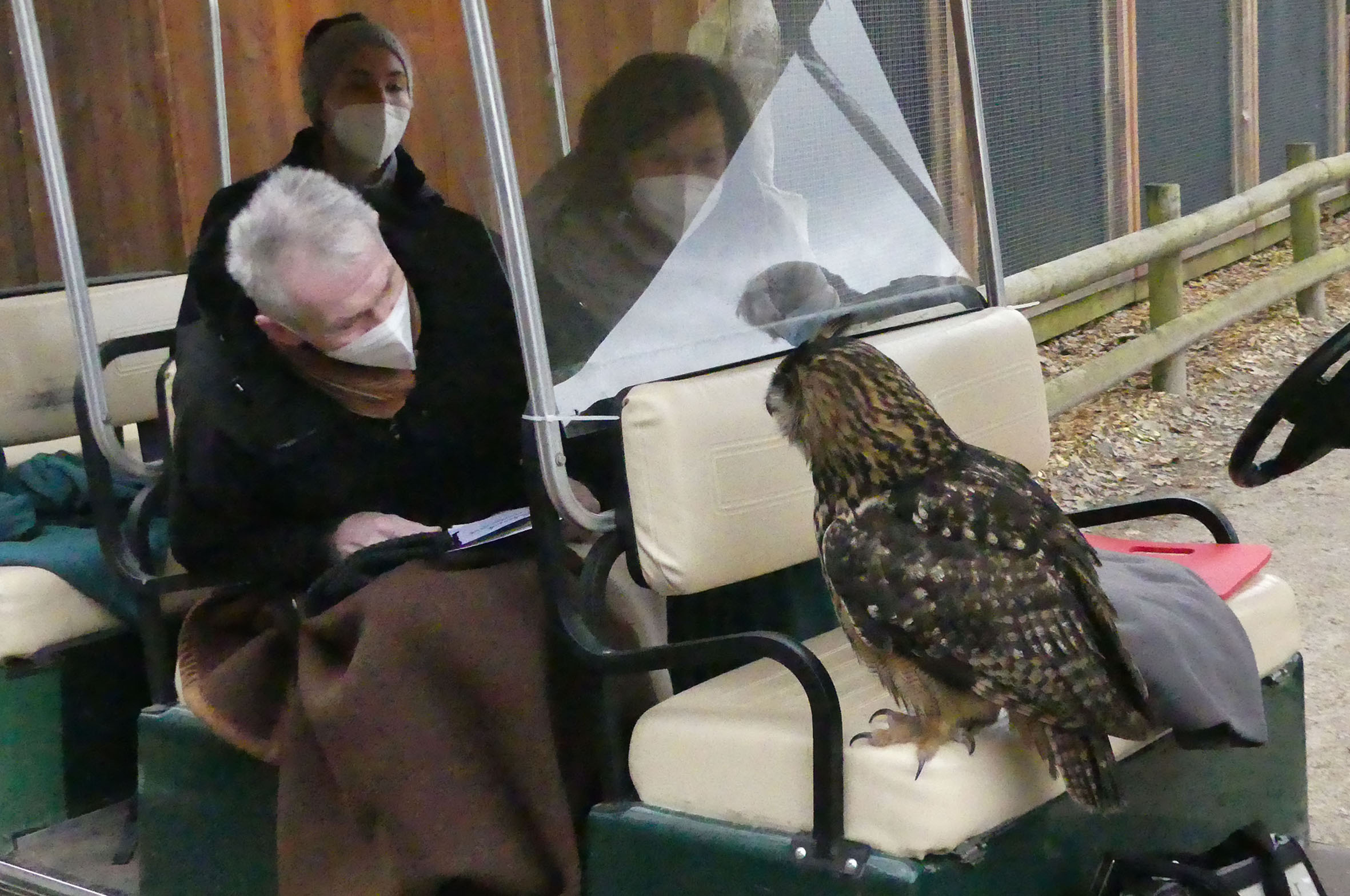 Unser nächster Halt ist die Flugschau. Zwar findet gerade keine offizielle Veranstaltung statt, aber auch hier haben die Kollegen eine Überraschung parat. Ein Uhu wartet auf dem Handschuh seiner Trainerin auf uns. Er soll einen großen Bogen fliegen und dann in unserem Wagen landen. Vielleicht hat er sich beim ersten Anflug verschätzt? Auf jeden Fall rauscht dieser große Vogel durch unseren Wagen und startet einen neuen Versuch. Beim Anblick der riesigen Schwingen und des starr ausgerichteten Blickes möchte man sich reflexartig irgendwo in Sicherheit bringen. Aber der Uhu ist schließlich ein Profi, und im nächsten Anlauf klappt es dann auch - und Fahrgast und Vogel sitzen sich Auge in Auge gegenüber. Ein ganz besonderer Moment, denn diese beeindruckenden Tiere sehen von Nahem mit ihren großen Krallen und dem kräftigen Schnabel noch Respekt einflößender aus.
