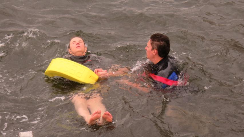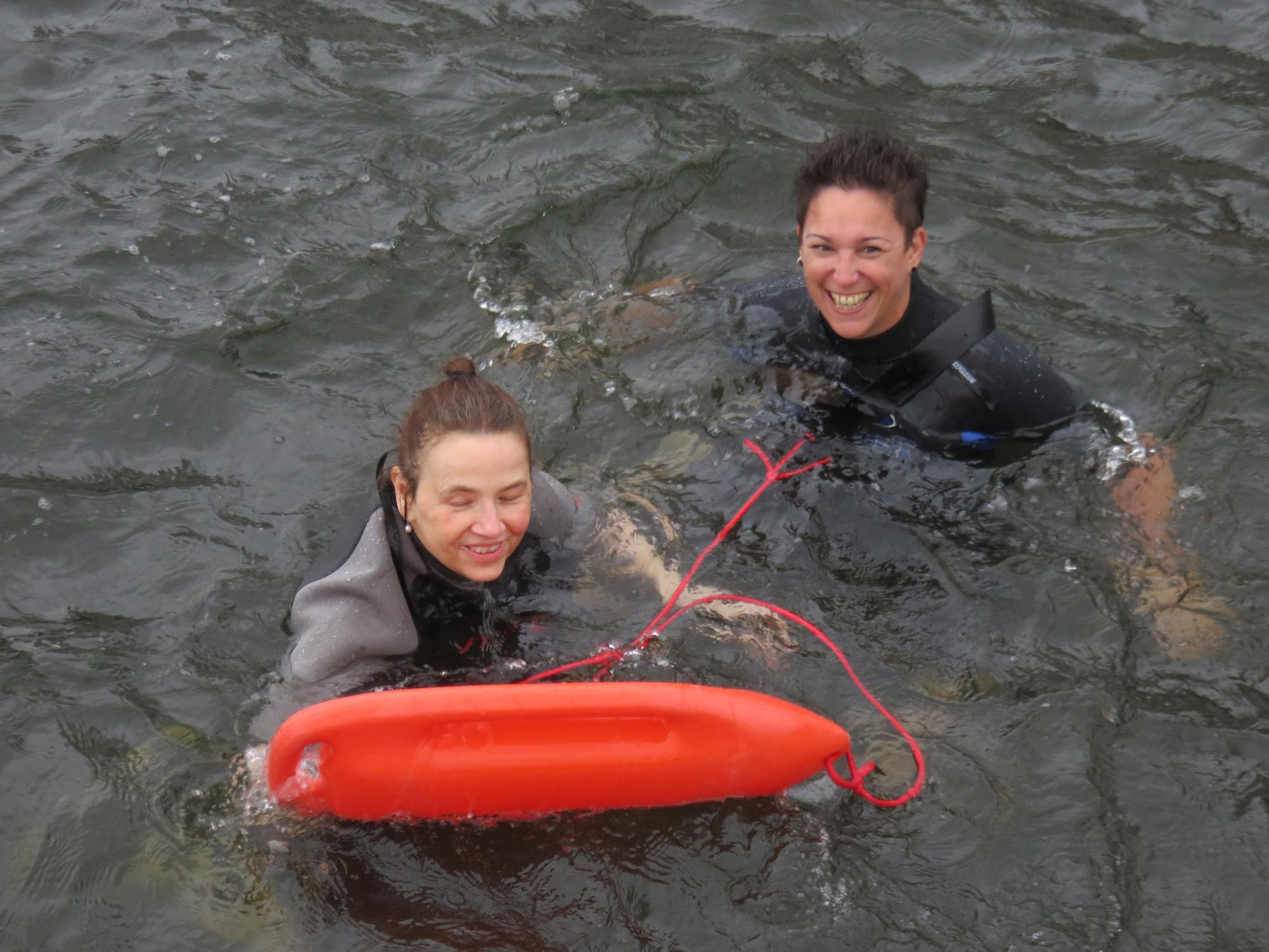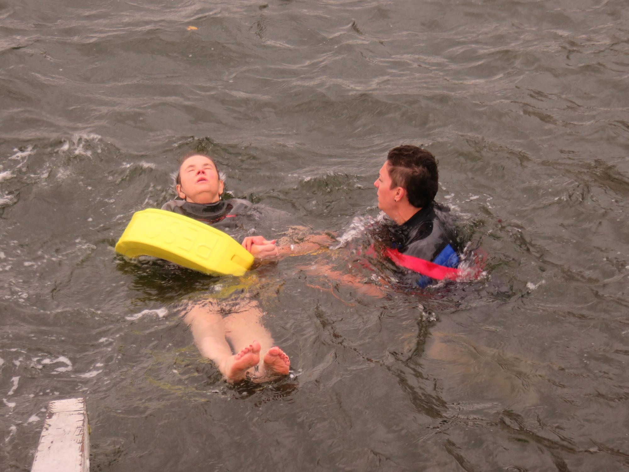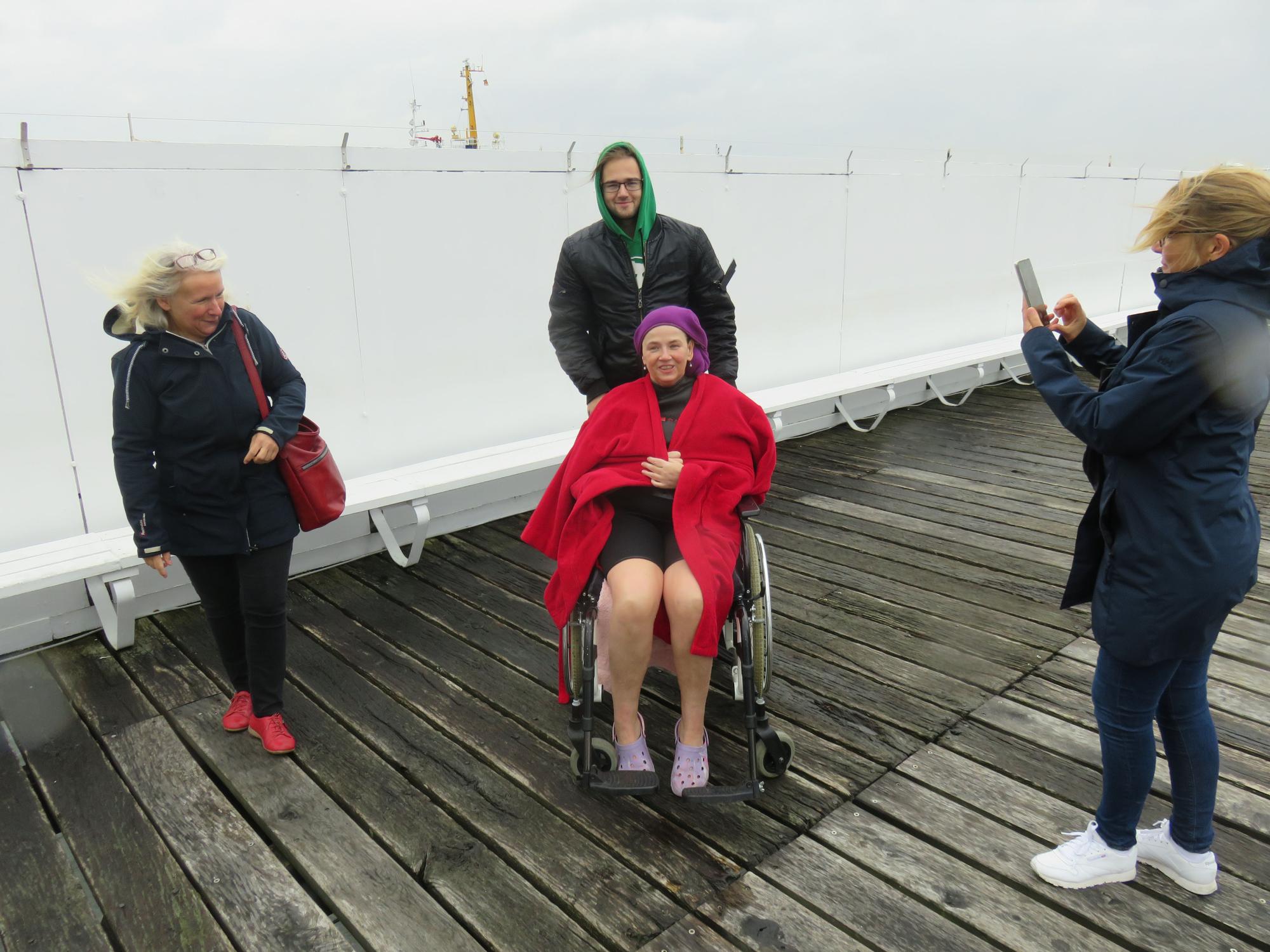 Wir machten uns fertig für die Fahrt, Ivonnes Sohn begleitete sie im Wünschewagen, ihre Freunde fuhren uns hinterher. An der Seebadeanstalt, die eigentlich bereits in der Winterpause ist, wartete Sven mit Neoprenanzügen auf uns. Wir entschieden, dass ich mit Ivonne ins Wasser gehe. Sven hatte auch einen Schwimmgürtel und eine Rettungsboje mitgebracht, beides kam zum Einsatz. Die Worte von Ivonne im Wasser: „Geil, geil, geil….“ Sie erzählte, dass sie ganz oft bei Wind und Wetter schwimmen gegangen ist.