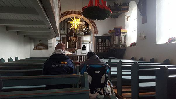 Weiter ging es in das Friesendorf Nebel. Auf die dortige St. Clemens Kirche von 1240 und den dazugehörigen Friedhof mit den „Sprechenden Grabsteinen“ aus dem 17. Jahrhundert freute sich unser Fahrgast ganz besonders. Ein Moment des Schweigens.