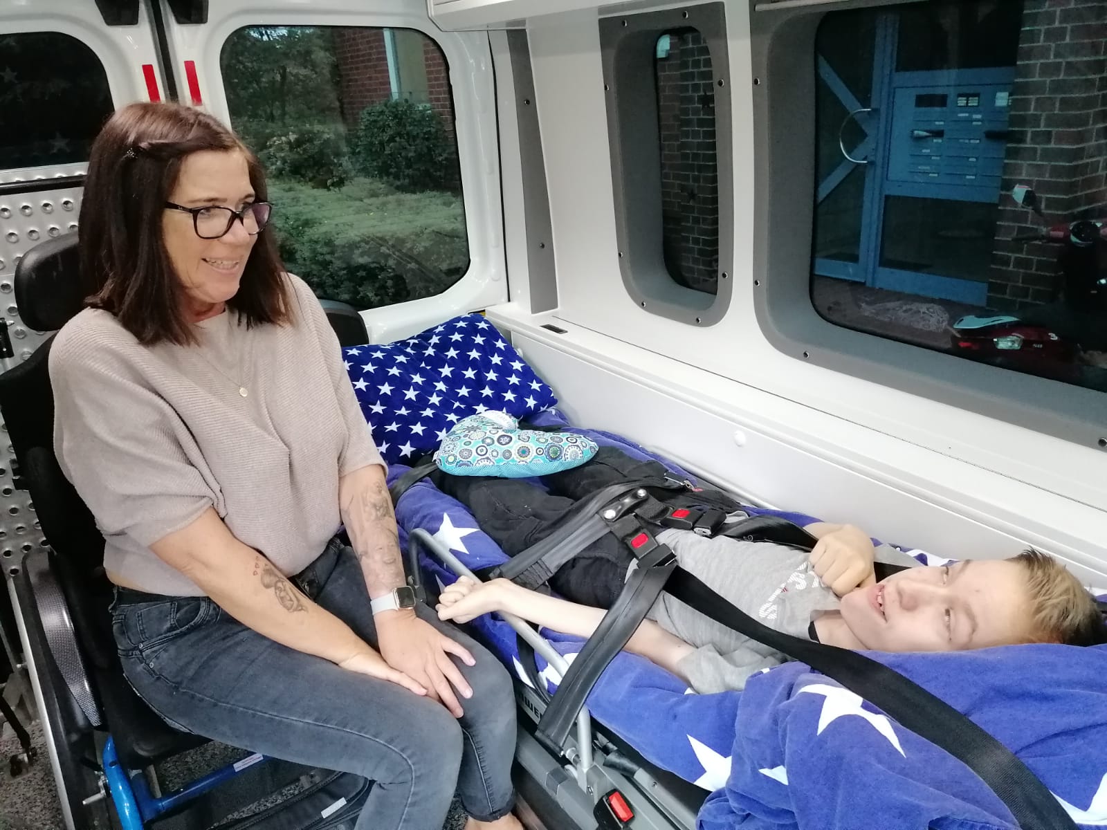 Nachdem ich mit meinem Kollegen Florian Stöver den Wünschewagen gecheckt hatte, ging es gegen 14 Uhr los nach Neumünster. Meine Freude war groß, denn ich durfte das erste Mal eine Wunschfahrt begleiten. In Neumünster sammelten wir zunächst unsere erfahrende Rettungssanitäterin Belinda Hüsemann ein und schauten dann noch einmal zusammen durch den Wagen. Dann ging es los zu Elias. Seine Mutter Susanne S. erwartete uns schon vor dem Haus und wies uns ein. Große Freude und Dankbarkeit standen ihr ins Gesicht geschrieben und die ersten Freudentränen kullerten. „Ohne den Wünschewagen könnten wir nicht in den Urlaub fahren!“, sagte Susanne und wischte sich eine Träne von der Wange. Bei der Begrüßung des 14-jährigen Elias herrschte große Freude, jedoch wurden wir direkt vor die Tatsache gestellt, dass wir mit der Trage nicht durch die verwinkelte Wohnung kommen. Belinda funktionierte die Bettdecke des Wünschewagens zum Tragetuch um und wir konnten Elias so raus aus der Wohnung direkt zur Trage bringen. Für Elias war das alles sehr anstrengend, aber als seine Mutter einen USB-Stick zückte, um im Wünschewagen seine Lieblingsmusik abzuspielen, war die Welt wieder in Ordnung.