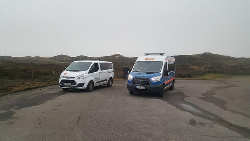 Auf Sylt angekommen, wartete bereits ein weiterer Mannschaftstransporter der DRK Bereitschaft Sylt. Nachdem die „Reisenden Riesen“ am Bahnhof von Westerland bestaunt worden waren, ging die Fahrt in den Kiefernwald in Rantum mit einem kleinen Spaziergang zur Bucht. Am Hafen von Hörnum waren die zwei Seehunde, die sich hier regelmäßig aufhalten, leider nicht da, dafür entschädigte die Weiterfahrt an den Dünen entlang. Unser Fahrgast war überwältigt von ihnen und sagte immer wieder: „Das sind ja richtige Berge!“