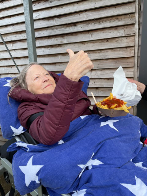 Das kleine Bärchen wurde in der Zwischenzeit „Knopfauge“ getauft, ihm hat sie erzählt, wie gut es ihr geht, wie unglaublich schön dieser Tag für sie ist („Das ist einer der schönsten Tage meines Lebens! Es sind alle so lieb und freundlich!“) und wie sehr sie das alles genießt. Ich stand häufig in ihrer Nähe und habe etwas mitgehört, berührt und beeindruckt von ihr und ihrer Lebensfreude. Tage mit dem Wünschewagen sind Tage, die niemals enden sollen. Weil die Momente so intensiv sind, allen bewusst ist, dass es etwas ganz Besonderes ist und so nicht wiederholt werden kann. Wie soll so ein Tag enden, der schon so wunderbar begonnen hat…? Darauf gibt es vermutlich nur eine Antwort: Mit Pommes! Marco und Vivian verabschieden sich, wir fahren mit dem Wünschewagen an den Weidefelder Strand. Hier gibt es „die weltbesten Pommes“, wenn man Theo, dem Eigentümer glaubt. An diesem Abend waren sie das, ganz besonders, weil es zu der Einladung zu Pommes & Cola auch noch Anerkennung und liebe Worte gab. Ich hoffe, dass alle Menschen, die uns an diesen Tagen durch kleine oder große Gesten unterstützen, und anlächeln oder etwas Nettes sagen wissen, wie sehr wir das wertschätzen. Gerade die gefühlten Kleinigkeiten sind die, die häufig ganz besonders in Erinnerung bleiben.