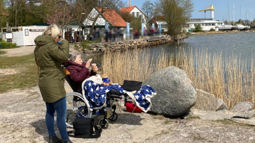Mit den Fischbrötchen und einem Aal im Gepäck machen wir uns auf den Weg zu unserer „VIP-Location“. Herr Traulsen hat seinen Teil unserer Arbeitsteilung optimal erfüllt und erwartet uns vor Ort. Wir dürfen auf die Terrasse des „Pier-Speicher“, eine tolle Location, direkt mit Blick auf den Hafen, wo wir windgeschützt sitzen können. Das Team vor Ort ist reizend, der Kaffee sehr lecker (Ich komme wieder!) und das Fischbrötchen scheinbar die absolute Erfüllung. Herr Traulsen bleibt, schnackt mit Clara und Lucie über den Wunsch, nach Kappeln zu kommen (was er scheinbar sehr gut verstehen kann), mit Laura und Patrick über den Wünschewagen, Fahrkünste (vermutlich meine) und ich bin ein bisschen begeistert, wie schön dieser Tag bereits ist. Clara macht sich zwischendurch jede Menge Gedanken. Ob Herr Traulsen nicht friert, weil er nur ein Jacket trägt. Ob der Aal, den wir gekauft haben, nicht zu teuer ist. Ob ich wirklich den schweren Rollstuhl schieben kann, weil ich einige Tage vorher gefallen bin und meine Hände etwas lädiert sind. In all dem steckt so was wie eine Unsicherheit, ob sie „diesen ganzen Aufwand wirklich wert ist“ - Lucie bestätigt, dass es für ihre Mutter gar nicht so leicht ist, das alles anzunehmen. Ja, liebe Clara, das warst und bist du, inkl. Fischbrötchen und allem, was dazu gehört! Den Fahrgästen entstehen nie Kosten, weil das, was wir bezahlen, vom ASB übernommen wird – weil es viele Spenderinnen und Spender gibt. Umso schöner, wenn wir, wie in diesem Fall, zum Kaffee eingeladen werden. Danke!