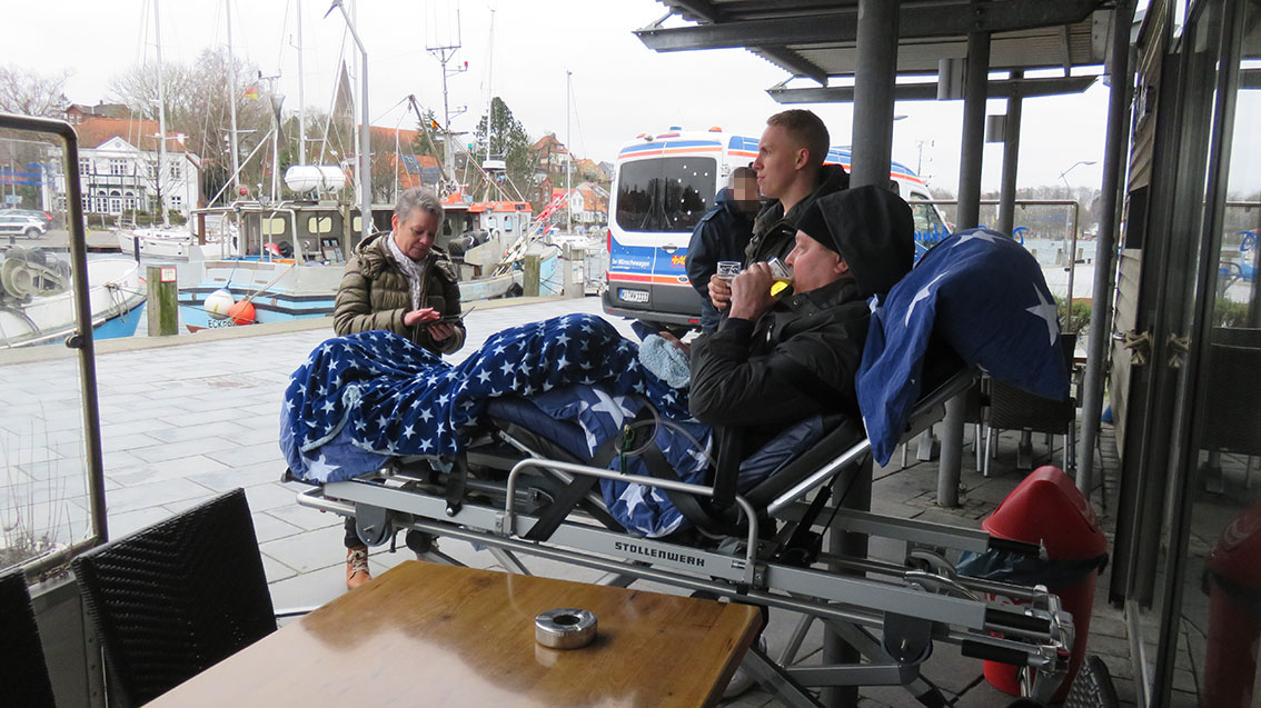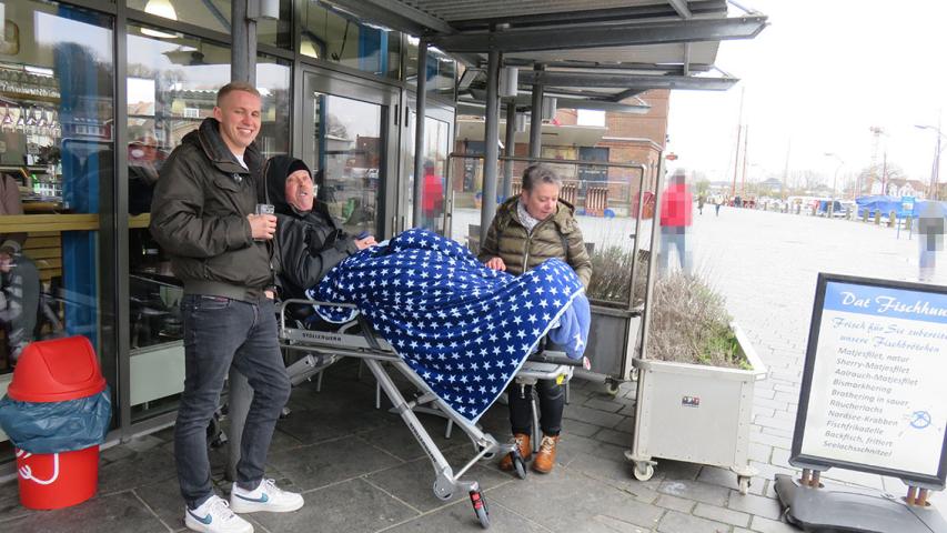 Wir suchten uns ein Plätzchen direkt am Hafen. Dank des netten Hafenmeisters wurden wir direkt an der alten Holzbrücke fündig, wo auch schon Reinhards Familie wartete. Gut eingepackt auf der Trage ging es dann zu einem kleinen Imbiss, der die sehnlich erwarteten Fischbrötchen für alle bereithielt. „Hering muss Schwimmen“, und so gab es für unseren Gast noch ein frisches Bier dazu, während der Wind ordentlich an den Schiffen und Kuttern im Hafen rüttelte.