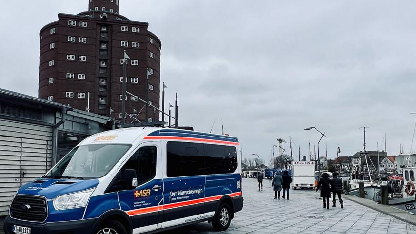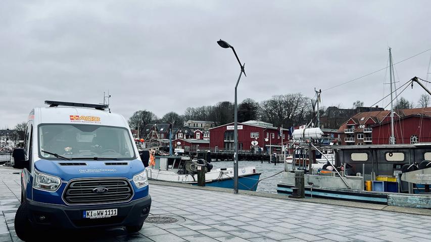 Mit dem Wünschewagen ging es am Kieler Hafen vorbei an den großen Fähren. An der Kiellinie schwappten die Wellen fast bis zur Straße, die Stege im Yachthafen waren trockenen Fußes nicht mehr zu passieren. Es gab ordentlich was zu gucken für unseren Gast.