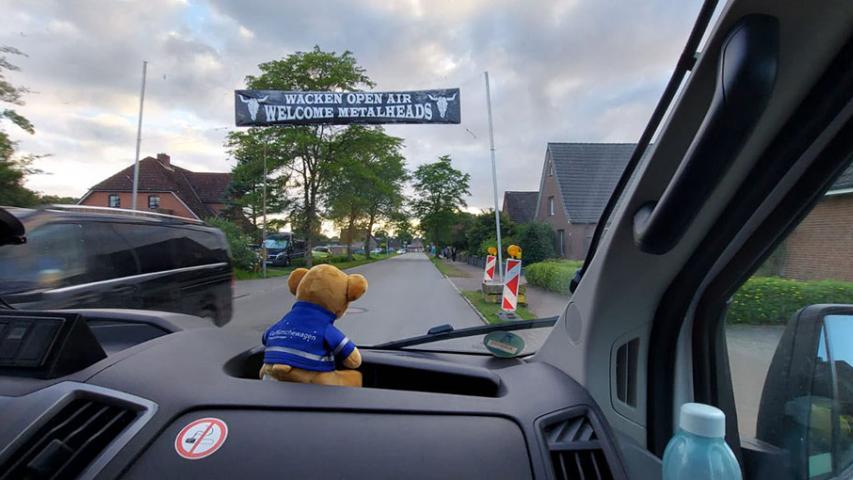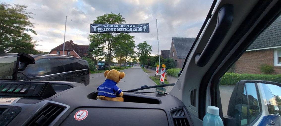 Die Nachbarn standen Spalier und zeigten begeistert den Wacken-Gruß, während unser Fahrgast strahlend vor Glückseligkeit all die einprasselnden Eindrücke verarbeiten musste. Unterwegs gab es stilecht ein Bier und aus den Lautsprechern kam… Iron Maiden, na klar. Parallel noch einige Telefonate mit Tim; Alles sah gut aus!