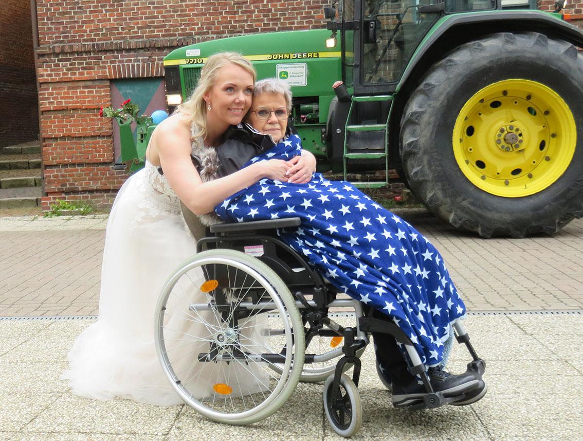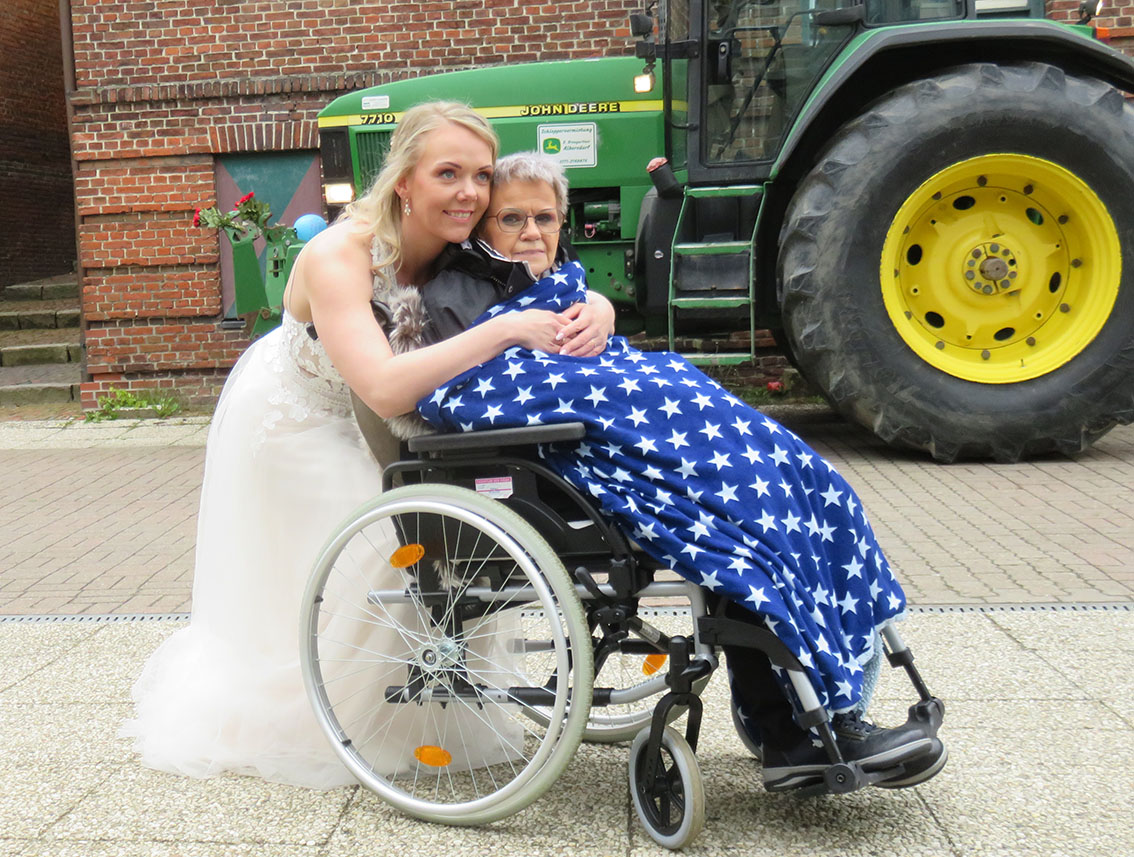 Liebevoll wurde für unseren Fahrgast ein ruhiges Plätzchen eingerichtet, damit sie am Polterabend teilnehmen konnte. Es war schön für sie, zwischen all den Gästen zu sitzen. Doch wir mussten bald wieder aufbrechen, weil sie erschöpft war und Kraft für den nächsten Tag sammeln musste.