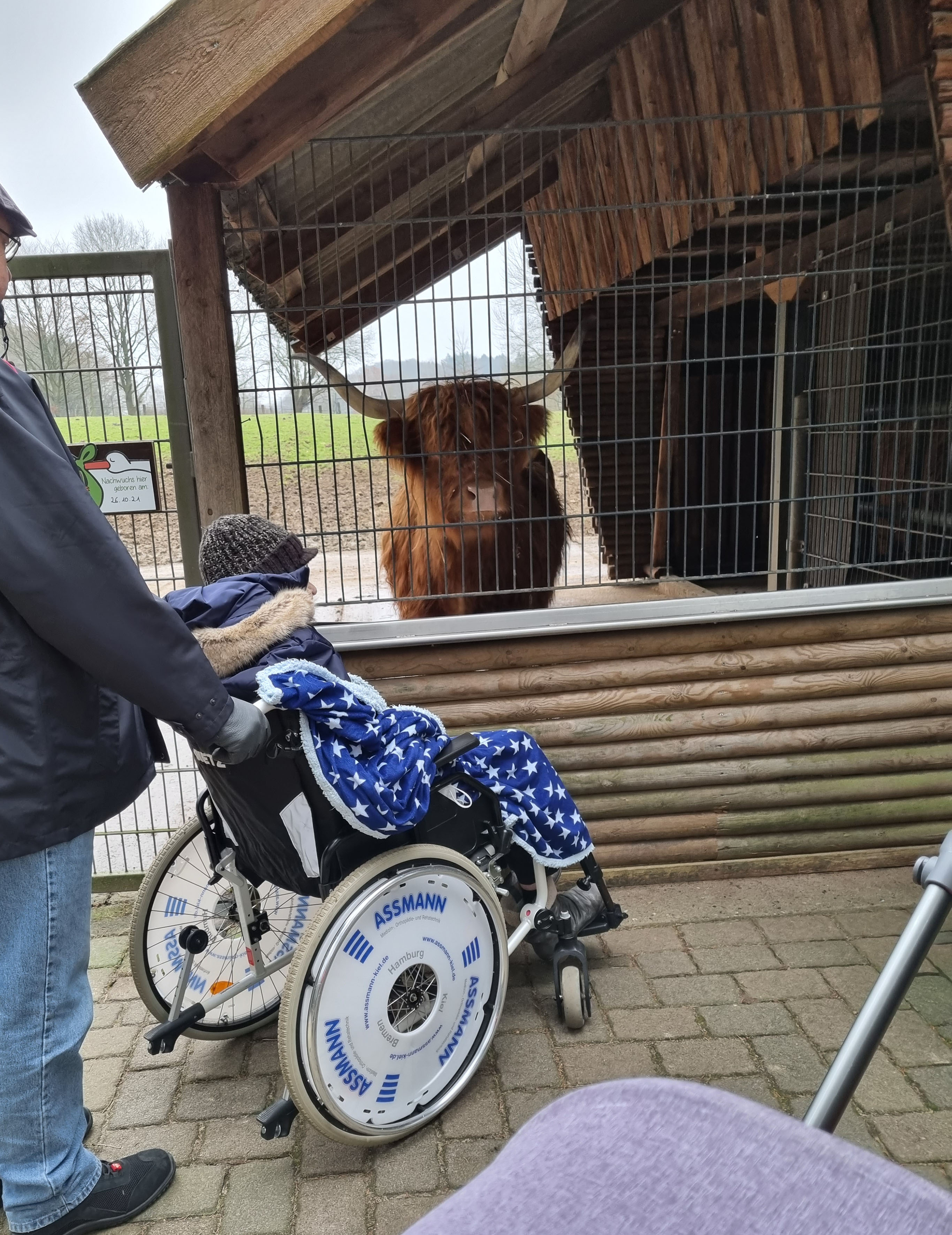 Einen Lageplan benötigten wir nicht, da sich Frau B. mit ihrer Familie hier so gut auskannte wie in ihrem eigenen Zuhause. Die Sorge, die Tiere könnten sich bei den geringen Temperaturen alle in ihren Hütten verkriechen, bestätigte sich nicht. Hochlandrinder, Ziegen, Rehe, Hängebauchschweine, sie alle schienen die Ruhe im wenig besuchten Park zu genießen und schauten interessiert, als wir näherkamen. Unter den wachsamen Augen von Frau B. durften die Enkelkinder dann noch zwei Packungen Tierfutter im Streichelgehege an die Ziegen verfüttern. Es war für uns wirklich schwer zu sagen, wer sich hier am meisten von allen freute.